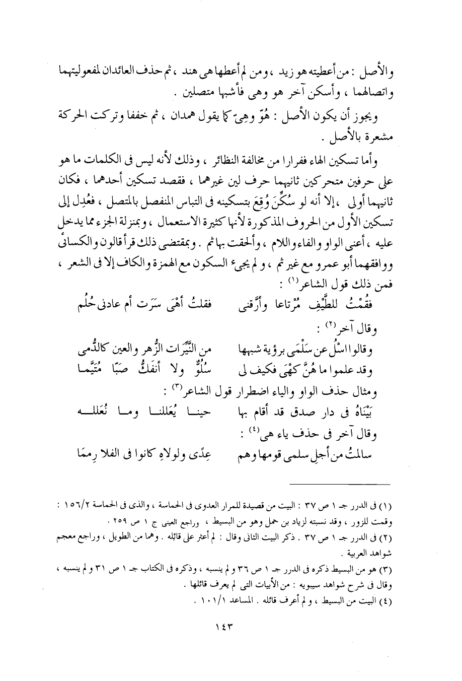 وأما تسكين الهاء ففرارا من مخالفة النظائر، وذلك لأنه ليس في الكلمات ما هو على حرفين متحركين ثانيهما حرف لين غيرهما، فقصد تسكين أحدهما، فكان ثانيهما أولى، إلا أنه لو سُكِّنَ وُقِعَ بتسكينه في التباس المنفصل بالمتصل، فعُدِل إلى تسكين الأول من الحروف المذكورة لأنها كثيرة الاستعمال، وبمنزلة الجزء مما يدخل عليه، أعني الواو والفاء واللام، وألحقت بها ثم. وبمقتضى ذلك قرأ قالون والكسائي ووافقهما أبو عمرو مع غير ثم، ولم يجئ السكون مع الهمزة والكاف إلا في الشعر، فمن ذلك قول الشاعر:
