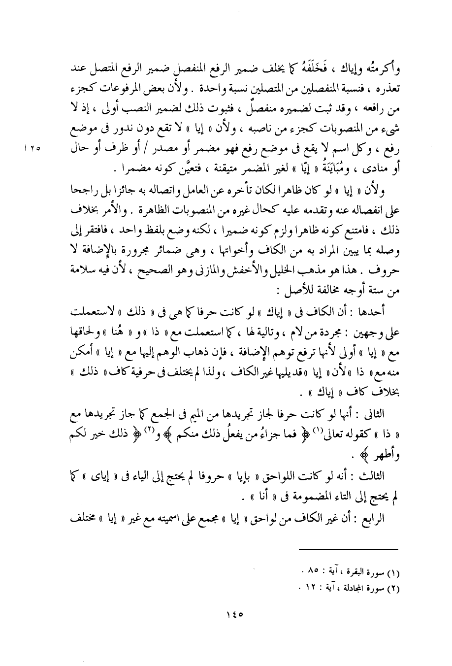 أحدها: أن الكاف في "إياك" لو كانت حرفا كما هي في "ذلك" لاستعملت على وجهين: مجردة من لام، وتالية لها، كما استعملت مع "ذا" و"هُنا" ولحاقها مع "إيا" أولى لأنها ترفع توهم الإضافة، فإن ذهاب الوهم إليها مع "إيا" أمكن منه مع "ذا" لأن "إيا" قد يليها غير الكاف، ولذا لم يختلف في حرفية كاف "ذلك" بخلاف كاف "إياك".