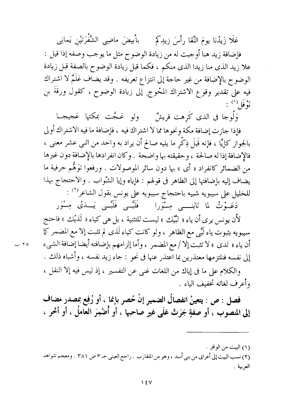 فإضافة زيد هنا أوجبت له من الزيادة الوضوح مثل ما يوجب وصفه إذا قيل: علا زيد الذي منا زيدا الذي منكم، فكما قبل زيادة الوضوح بالصفة قبل زيادة الوضوح بالإضافة من غير حاجة إلى انتزاع تعريفه. وقد يضاف عَلَمٌ لا اشتراك فيه على تقدير وقوع الاشتراك المحْوجِ إلى زيادة الوضوح، كقول وَرقَةَ بنِ نَوْفَل: