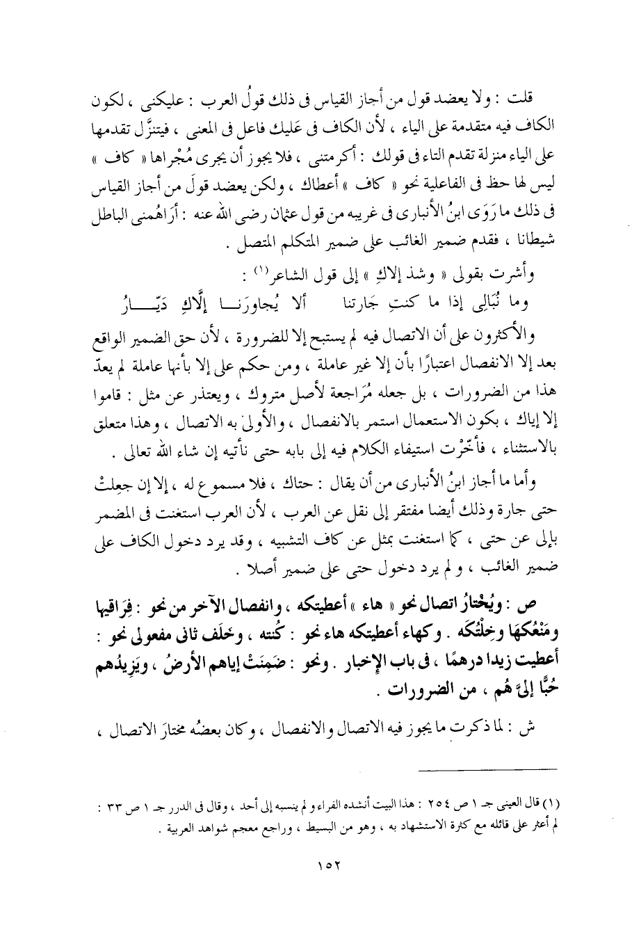والأكثرون على أن الاتصال فيه لم يستبح إلا للضرورة، لأن حق الضمير الواقع بعد إلا الانفصال اعتبارًا بأن إلا غير عاملة، ومن حكم على إلا بأنها عاملة لم يعدّ هذا من الضرورات، بل جعله مُراجعة لأصل متروك، ويعتذر عن مثل: قاموا إلا إياك، بكون الاستعمال استمر بالانفصال، والأولى به الاتصال، وهذا متعلق بالاستثناء، فأخّرْت استيفاء الكلام فيه إلى بابه حتى نأتيه إن شاء الله تعالى.