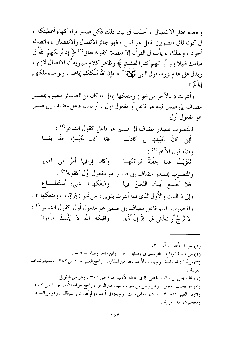 وأشرت "بالآخر من نحو (ومنعكها) إلى ما كان من الضمائر منصوبا بمصدر مضاف إلى ضمير قبله وهو فاعل أو مفعول أول، أو باسم فاعل مضاف إلى ضمير هو مفعول أول.