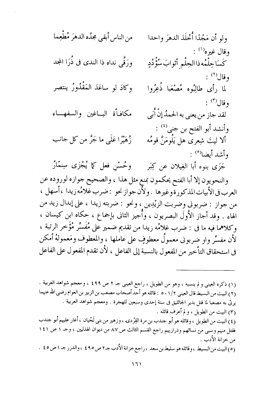 والنحويون إلا أبا الفتح يحكمون بمنع مثل هذا، والصحيح جوازه لوروده عن العرب في الأبيات المذكورة وغيرها، ولأن جواز نحو: ضرب غلامُه زيدا، أسهل من جواز: ضربوني وضربت الزيْدِين،، ونحو: ضربته زيدا، على إبدال زيد من الهاء. وقد أجاز الأولَ البصريون، وأُجيز الثاني بإجماع، حكاه ابن كيسان، وكلاهما فيه ما في: ضرب غلامُه زيدا من تقديم ضمير على مُفَسِّر مُؤَخر الرتبة، لأن مفسِّر واو ضربوني معمولُ معطوفٍ على عاملها، والمعطوف ومعمولهُ أمكن في استحقاق التأخير من المفعول بالنسبة إلى الفاعل، لأن تقدم المفعول على الفاعل
