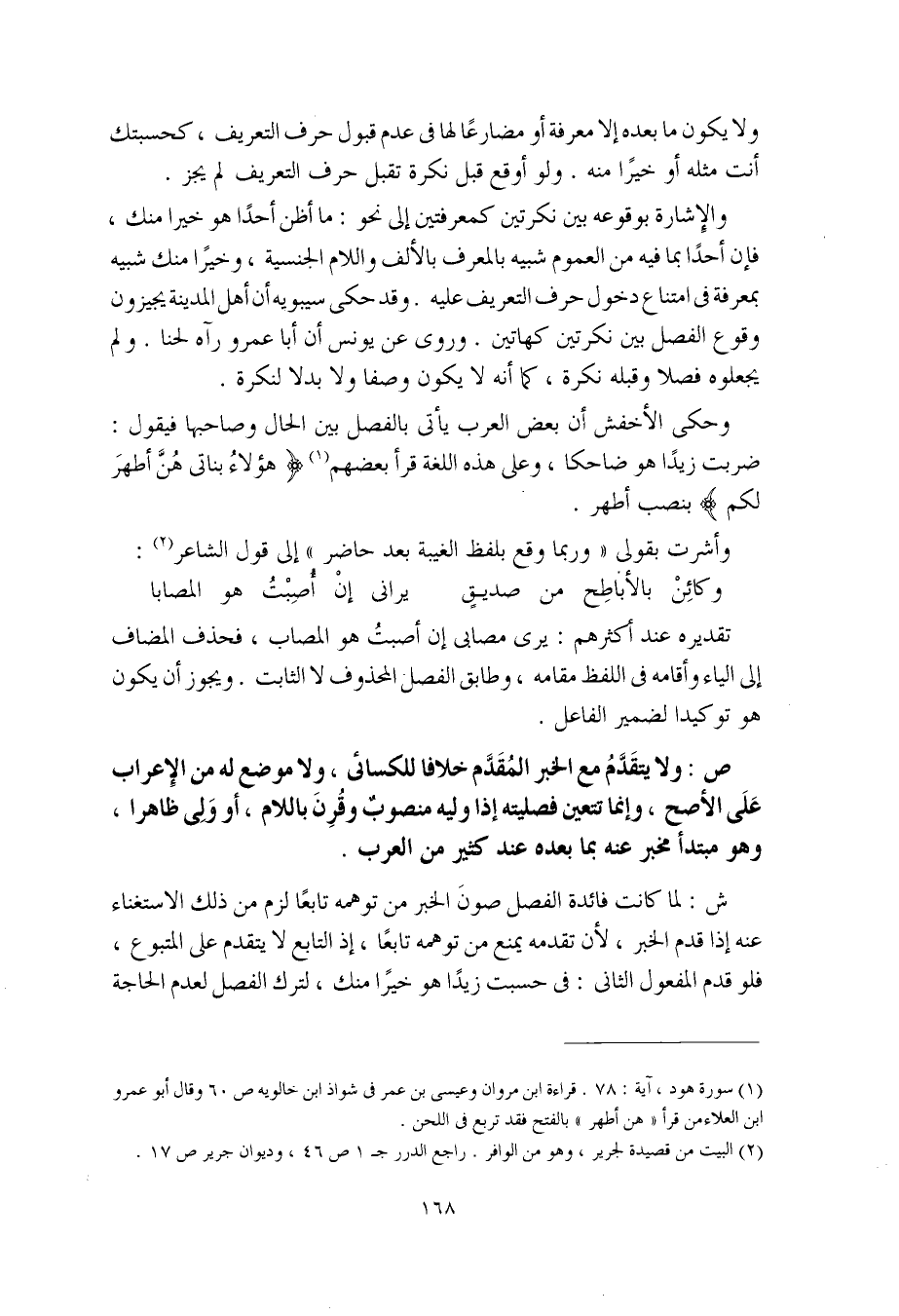 والإشارة بوقوعه بين نكرتين كمعرفتين إلى نحو: ما أظن أحدًا هو خيرا منك، فإن أحدًا بما فيه من العموم شبيه بالمعرف بالألف واللام الجنسية، وخيرًا منك شبيه بمعرفة في امتناع دخول حرف التعريف عليه. وقد حكى سيبويه أن أهل المدينة يجيزون وقوع الفصل بين نكرتين كهاتين. وروى عن يونس أن أبا عمرو رآه لحنا. ولم يجعلوه فصلا وقبله نكرة، كما أنه لا يكون وصفا ولا بدلا لنكرة.
