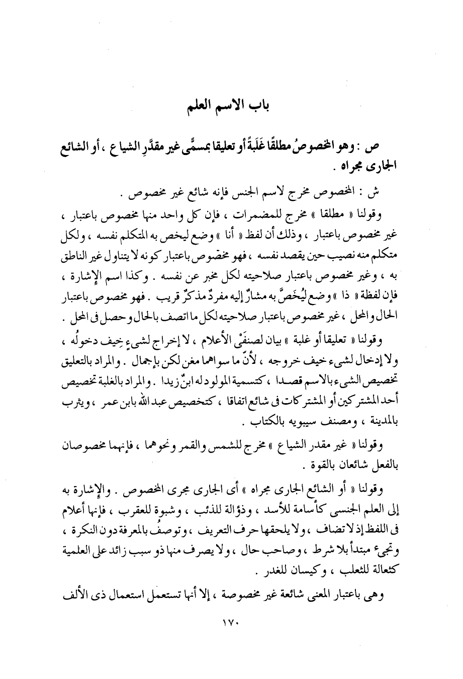وقولنا "أو الشائع الجاري مجراه" أي الجاري مجرى المخصوص. والإشارة به إلى العلم الجنسي كأسامة للأسد، وذؤالة للذئب، وشبوة للعقرب، فإنها أعلام في اللفظ إذ لا تضاف، ولا يلحقها حرف التعريف، وتوصفُ بالمعرفة دون النكرة، وتجيء مبتدأ بلا شرط، وصاحب حال، ولا يصرف منها ذو سبب زائد على العلمية كثعالة للثعلب، وكيسان للغدر.