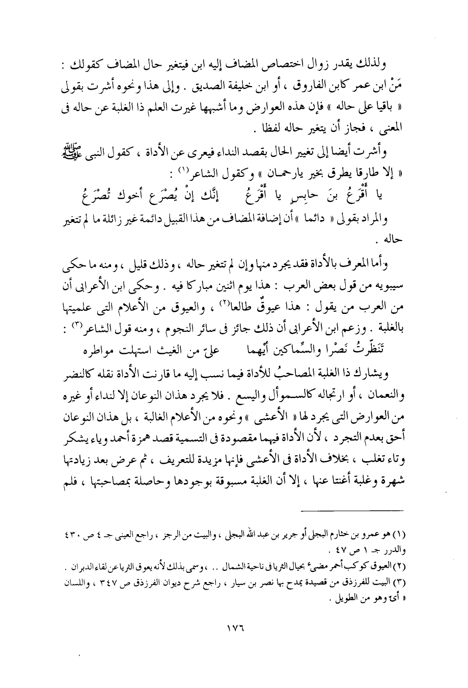 ولذلك يقدر زوال اختصاص المضاف إليه ابن فيتغير حال المضاف كقولك: مَنْ ابن عمر كابن الفاروق، أو ابن خليفة الصديق. وإلى هذا ونحوه أشرت بقولي "باقيا على حاله" فإن هذه العوارض وما أشبهها غيرت العلم ذا الغلبة عن حاله في المعنى، فجاز أن يتغير حاله لفظا.