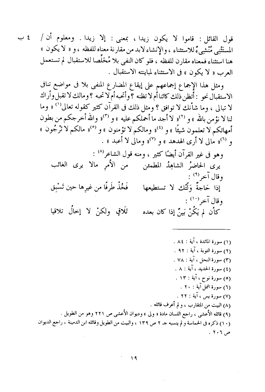 ومثل هذا الإجماع إجماعهم على إيقاع المضارع المنفي بلا في مواضع تنافي الاستقبال نحو: أتظن ذلك كائنا أم لا تظنه؟ وأتحبه أم لا تحبه؟ ومالك لا تقبل وأراك لا تبالي، وما شأنك لا توافق؟ ومثل ذلك في القرآن كثير كقوله تعالى "وما لنا لا نؤمن بالله" و"لا أجد ما أحملكم عليه" و"والله أخرجكم من بطون أمهاتكم لا تعلمون شيئا" و"ومالكم لا تؤمنون" و"مالكم لا ترجون" و"مالي لا أرى الهدهد" و"مالي لا أعبد".