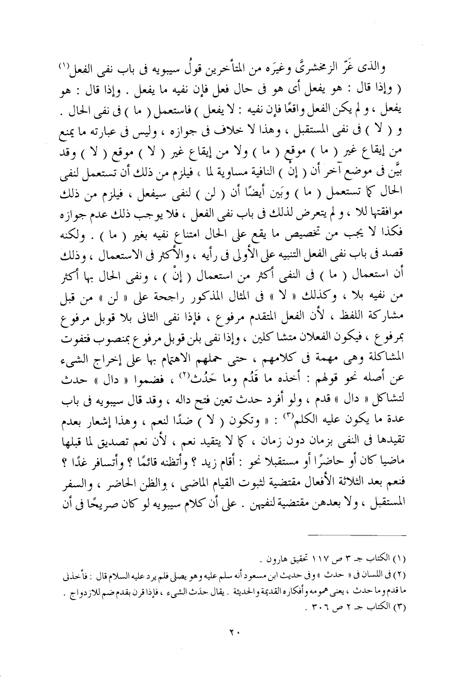 والذي غَرّ الزمخشريَّ وغيرَه من المتأخرين قولُ سيبويه في باب نفي الفعل (وإذا قال: هو يفعل أي هو في حال فعل فإن نفيه ما يفعل. وإذا قال: هو يفعل، ولم يكن الفعل واقعًا فإن نفيه: لا يفعل) فاستعمل (ما) في نفي الحال و (لا) في نفي المستقبل، وهذا لا خلاف في جوازه، وليس في عبارته ما يمنع من إيقاع غثر (ما) موقع (ما) ولا من إيقاع غير (لا) موقع (لا) وقد بيَّن في موضع آخر أن (إنْ) النافية مساوية لما، فيلزم من ذلك أن تستعمل لنفي الحال كما تستعمل (ما) وبَين أيضًا أن (لن) لنفي سيفعل، فيلزم من ذلك موافقتها للا، ولم يتعرض لذلك في باب نفي الفعل، فلا يوجب ذلك عدم جوازه فكذا لا يجب من تخصيص ما يقع على الحال امتناع نفيه بغير (ما)، ولكنه قصد في باب نفي الفعل التنبيه على الأولى في رأيه، والأكثر في الاستعمال، وذلك أن استعمال (ما) في النفي أكثر من استعمال (إنْ)، ونفي الحال بها أكثر من نفيه بلا، وكذلك "لا" في المثال المذكور راجحة على "لن" من قبل مشاركة اللفظ، لأن الفعل المتقدم مرفوع، فإذا نفي الثاني بلا قوبل مرفوع بمرفوع، فيكون الفاعلان متشاكلينن وإذا نفي بلن قوبل مرفوع بمنصوب فتفوت المشاكلة وهي مهمة في كلامهم، حتى حملهم الاهتمام بها على إخراج الشي عن أصله نحو قولهم: أخذه ما قَدُم وما حَدُث، فضموا "دال" حدث لتشاكل "دال" قدم، ولو أفرد حدث تعين فتح داله، وقد قال سيبويه في باب عدة ما يكون عليه الكلم: "وتكون (لا) ضدًا لنعم، وهذا إشعار بعدم تقيدها في النفي بزمان دون زمان، كما لا يتقيد نعم، لأن نعم تصديق لما قبلها ماضيا كان أو حاضرًا أو مستقبلا نحو: أقام زيد؟ وأتظنه قائمًا؟ وأتسافر غدًا؟ فنعم بعد الثلاثة الأفعال مقتضية لثبوت القيام الماضي، والظن الحاضر، والسفر المستقبل، ولا بعدهن مقتضية لنفيهن، على أن كلام سيبويه لو كان صريحًا في أن