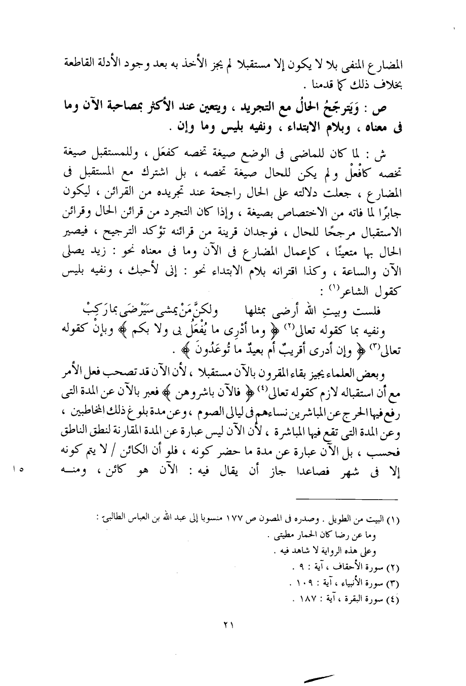 ش: لما كان للماضي في الوضع صيغة تخصه كفعَل، وللمستقبل صيغة تخصه كافْعَلْ ولم يكن للحال صيغة تخصه، بل اشترك مع المستقبل في المضارع، جعلت دلالته على الحال راجحة عند تجريده من القرائن، ليكون جابرًا لما فاته من الاختصاص بصيغة، وإذا كان التجرد من قرائن الحال وقرائن الاستقبال مرجحًا للحال، فوجدان قرينة من قرائنه تؤكد الترجيح، فيصير الحال بها متعينًا، كإعمال المضارع في الآن وما في معناه نحو: زيد يصلي الآن والساعة، وكذا اقترانه بلام الابتداء نحو: إني لأحبك، ونفيه بليس كقول الشاعر: