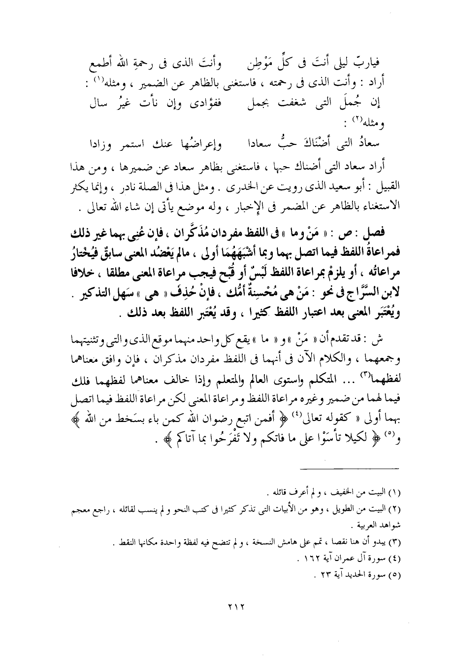 ش: قد تقدم أن "مَنْ" و"ما" يقع كل واحد منهما موقع الذي والتي وتثنيتهما وجمعهما، والكلام الآن في أنهما في اللفظ مفردان مذكران، فإن وافق معناهما لفظهما ... المتكلم واستوى العالم والمتعلم وإذا خالف معناهما لفظهما فلك فيما لهما من ضمير وغيره مراعاة اللفظ ومراعاة المعنى لكن مراعاة اللفظ فيما اتصل بهما أولى كقوله تعالى (أفمن اتبع رضوان الله كمن باء بسخط من الله) و (لكيلا تأسوا على ما فاتكم ولا تفرحوا بما آتاكم).