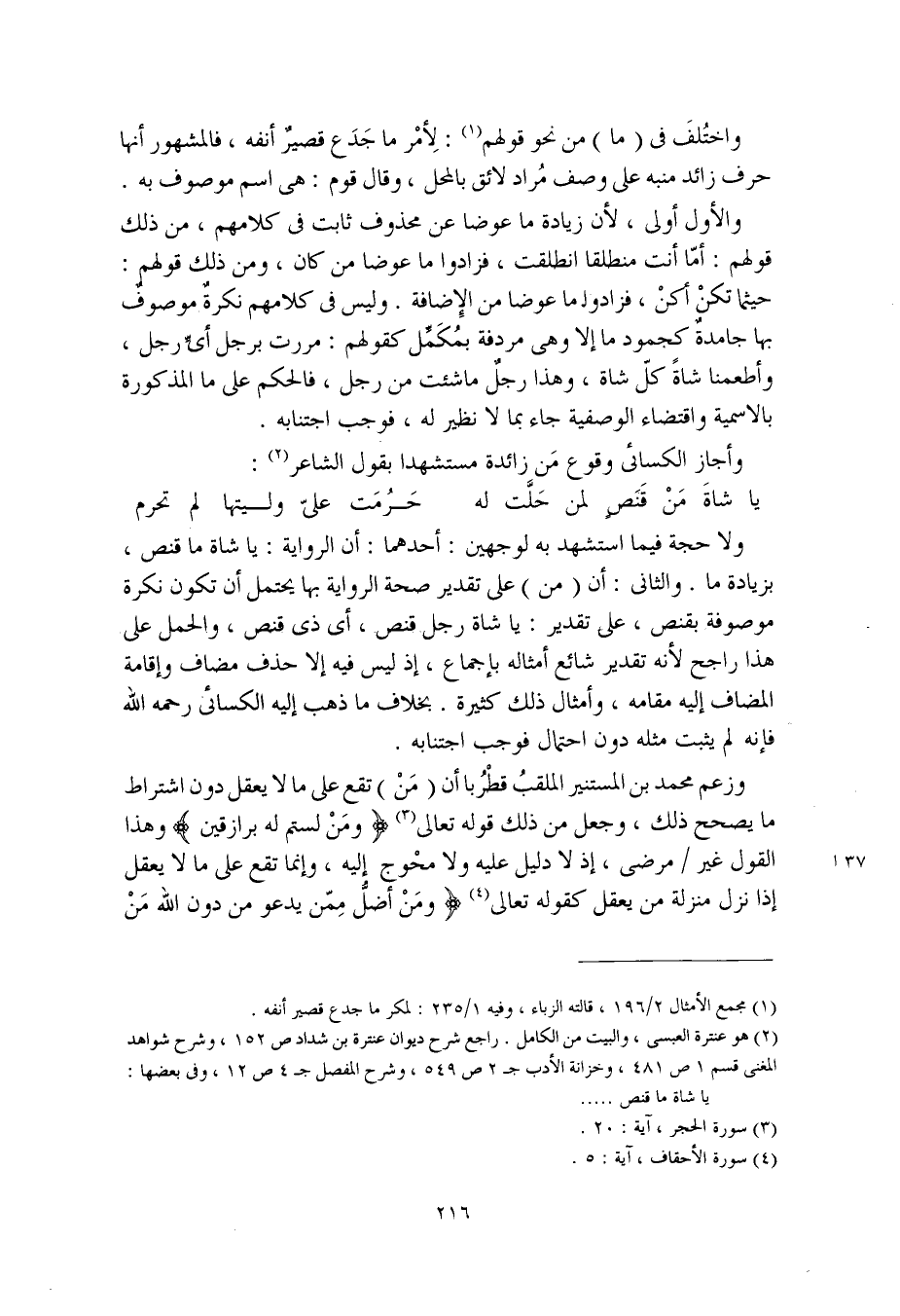 واختُلفَ في (ما) من نحو قولهم: لِأمْر ما جَدَع قصيرٌ أنفه، فالمشهور أنها حرف زائد منبه على وصف مُراد لائق بالمحل، وقال قوم: هي اسم موصوف به.