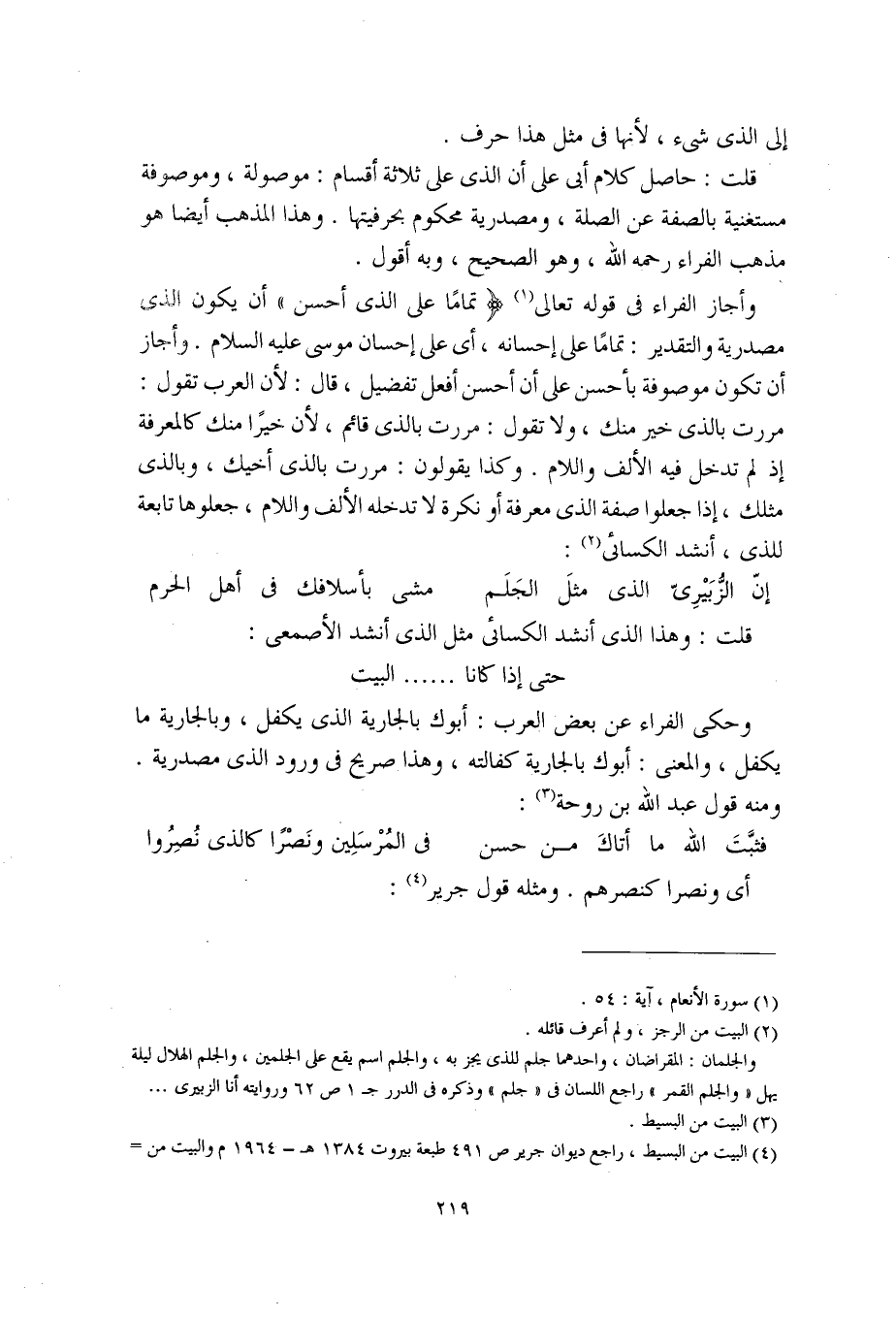وأجاز الفراء في قوله تعالى (تمامًا على الذي أحسن) أن يكون الذي مصدرية والتقدير: تمامًا على إحسانه، أي على إحسان موسى عليه السلام. وأجاز أن تكون موصوفة بأحسن على أن أحسن أفعل تفضيل، قال: لأن العرب تقول: مررت بالذي خير منك، ولا تقول: مررت بالذي قائم، لأن خيرًا منك كالمعرفة إذ لم تدخل فيه الألف واللام. وكذا يقولون: مررت بالذي أخيك، وبالذي مثلك، إذا جعلوا صفة الذي معرفة أو نكرة لا تدخله الألف واللام، جعلوها تابعة للذي، أنشد الكسائي: