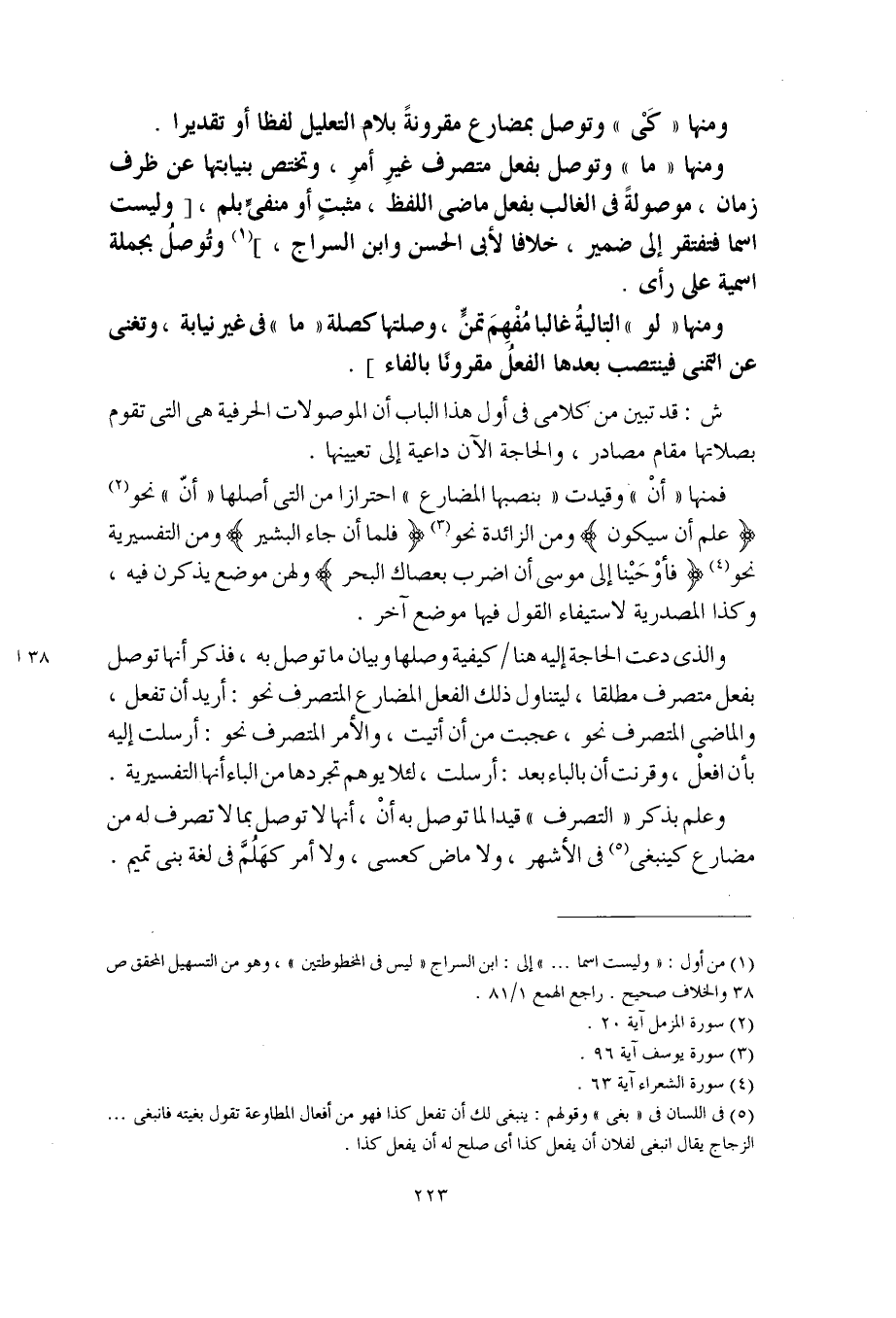 ش: قد تبين من كلامي في أول هذا الباب أن الموصولات الحرفية هي التي تقوم بصلاتها مقام مصادر، والحاجة الآن داعية إلى تعيينها.