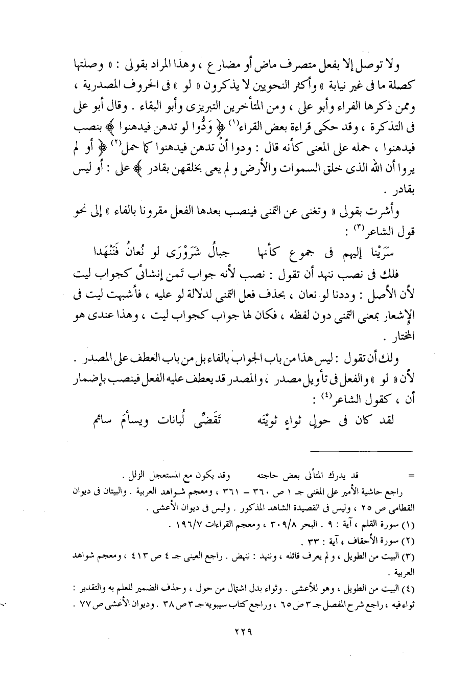 ولا توصل إلا بفعل متصرف ماض أو مضارع، وهذا المراد بقولي: "وصلتها كصلة ما في غير نيابة" وأكثر النحويين لا يذكرون "لو" في الحروف المصدرية، وممن ذكرها الفراء وأبو علي، ومن المتأخرين التبريزي وأبو البقاء. وقال أبو علي في التذكرة، وقد حكى قراءة بعض القراء (وَدُّوا لو تدهن فيدهنوا) بنصب فيدهنوا، حمله على المعنى كأنه قال: ودوا أنْ تدهن فيدهنوا كما حمل (أو لم يروا أن الله الذي خلق السموات والأرض ولم يعي بخلقهن بقادر) على: أو ليس بقادر.