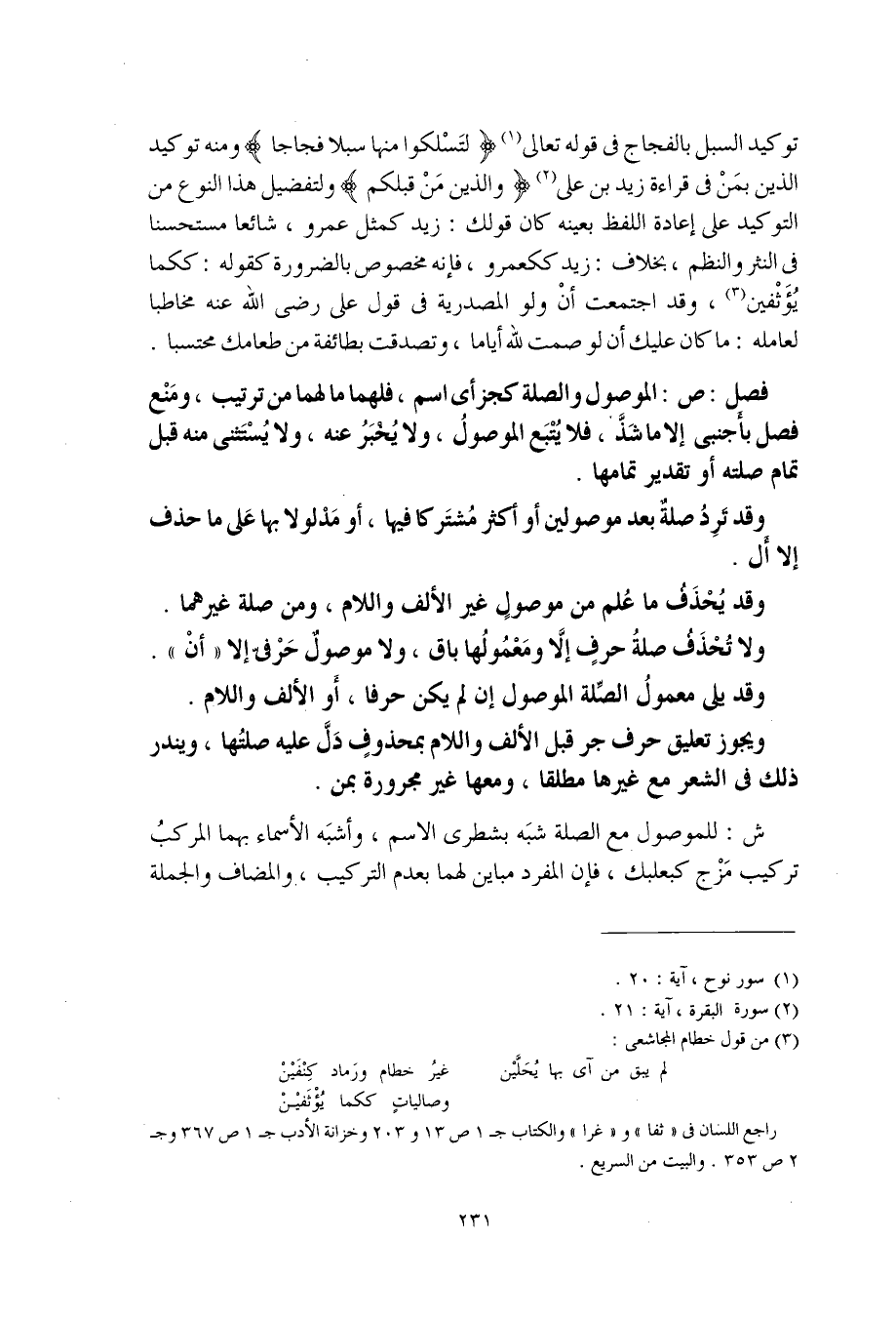 توكيد السبل بالفجاج في قوله تعالى (لتَسْلكوا منها سبلا فجاجا) ومنه توكيد الذين بمَنْ في قراءة زيد بن علي (والذين مَنْ قبلكم) ولتفضيل هذا النوع من التوكيد على إعادة اللفظ بعينه كان قولك: زيد كمثل عمرو، شائعا مستحسنا في النثر والنظم، بخلاف: زيد ككعمروا، فإنه مخصوص بالضرورة كقوله: ككما يُؤَثْفين، وقد اجتمعت أنْ ولو المصدرية في قول علي رضي الله عنه مخاطبا لعامله: ما كان عليك أن لو صمت لله أياما، وتصدقت بطائفة من طعامك محتسبا.