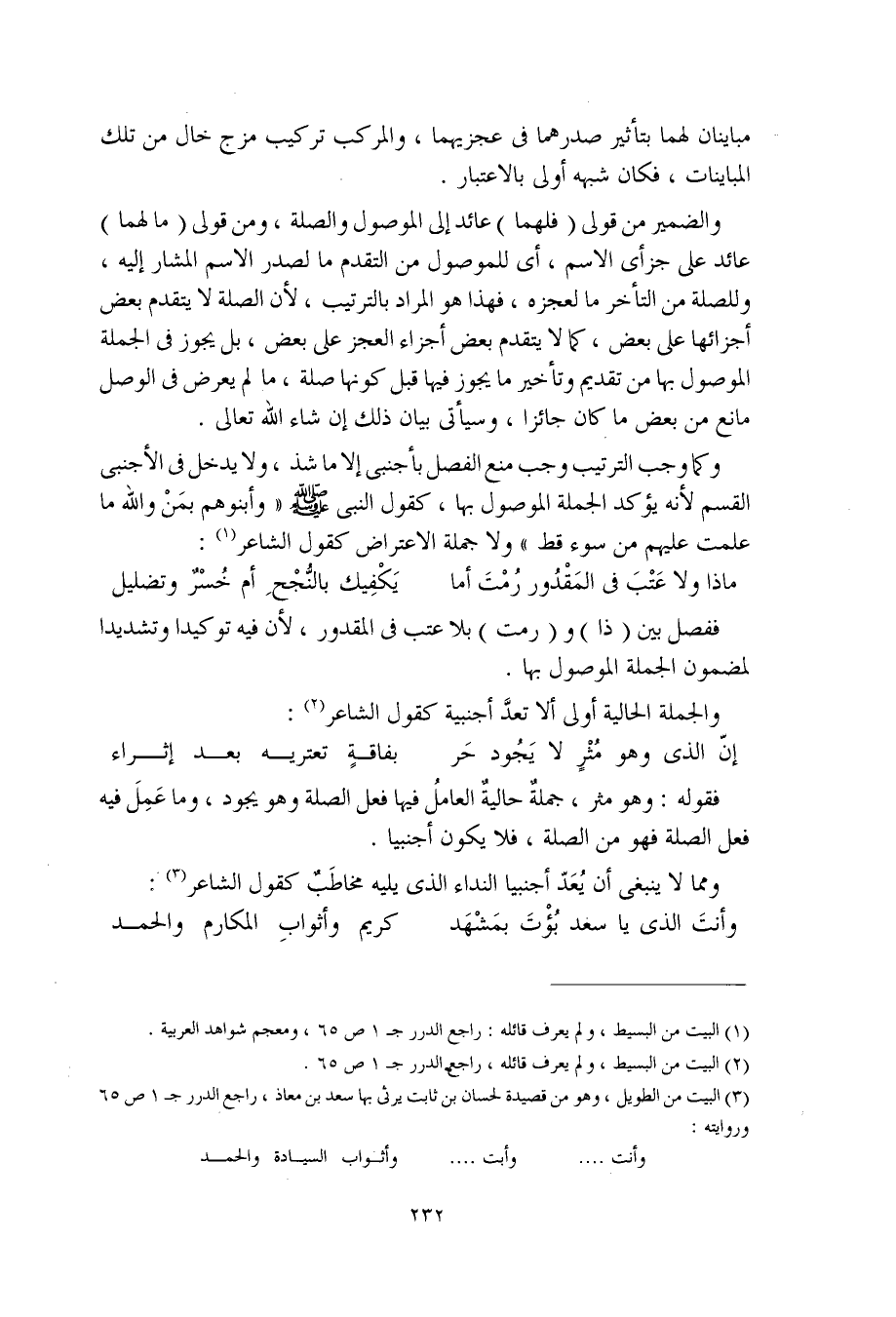 وكما وجب الترتيب وجب منع الفصل بأجنبي إلا ما شذ، ولا يدخل في الأجنبي القسم لأنه يؤكد الجملة الموصول بها، كقول النبي صلى الله عليه وسلم "وأبنوهم بمَنْ والله ما علمت عليهم من سوء قط" ولا جملة الاعتراض كقول الشاعر: