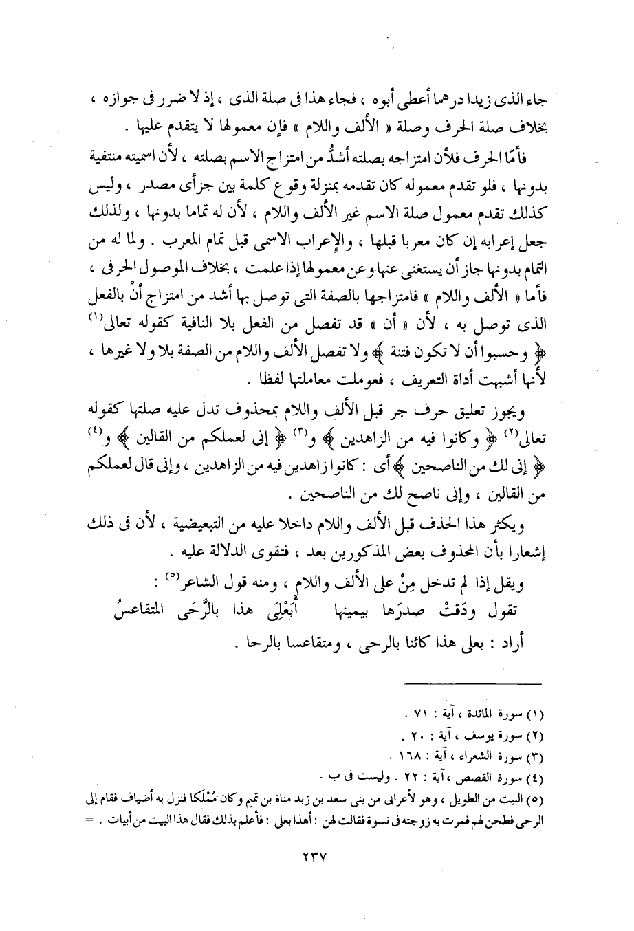 فأمّا الحرف فلأن امتزاجه بصلته أشدُّ من امتزاج الاسم بصلته، لأن اسميته منتفية بدونها، فلو تقدم معموله كان تقدمه بمنزلة وقوع كلمة بين جزأي مصدر، وليس كذلك تقدم معمول صلة الاسم غير الألف واللام، لأن له تماما بدونها، ولذلك جعل إعرابه إن كان معربا قبلها، والإعراب الاسمي قبل تمام المعرب. ولما له من التمام بدونها جاز أن يستغنى عنها وعن معمولها إذا علمت، بخلاف الموصول الحرفي، فأما "الألف واللام" فامتزاجها بالصفة التي توصل بها أشد من امتزاج أنْ بالفعل الذي توصل به، لأن "أن" قد تفصل من الفعل بلا النافية كقوله تعالى (وحسبوا أن لا تكون فتنة) ولا تفصل الألف واللام من الصفة بلا ولا غيرها، لأنها أشبهت أداة التعريف، فعوملت معاملتها لفظا.