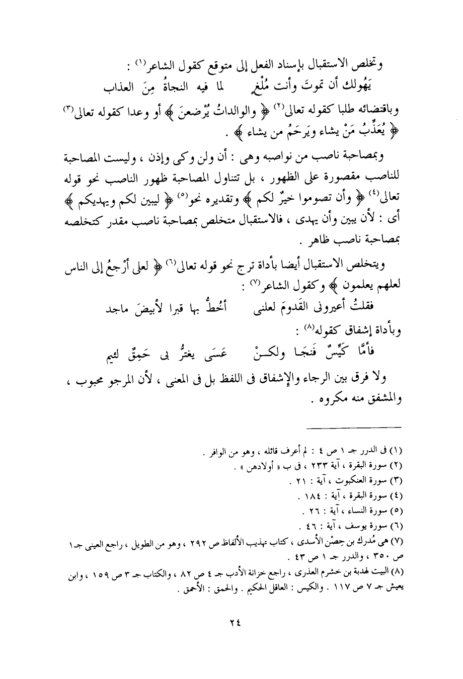ويتخلص الاستقبال أيضا بأداة ترج نحو قوله تعالى: (لعلي أرجعُ إلى الناس لعلهم يعلمون) وكقول الشاعر: