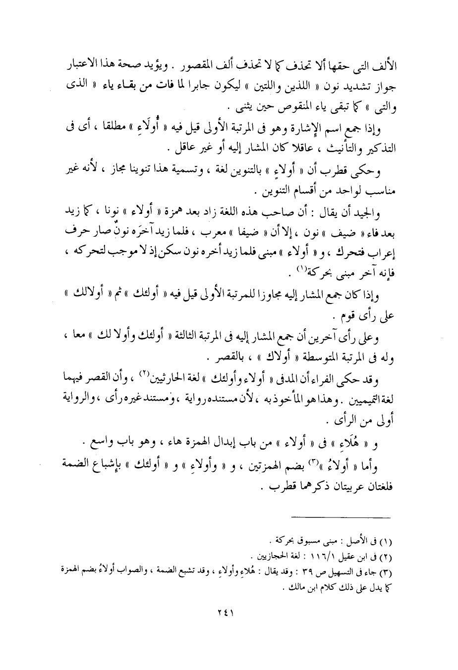 وقد حكى الفراء أن المدفى "أولاء وأولئك" لغة الحارثيين، وأن القصر فيهما لغة التميميين. وهذا هو المأخوذ به، لأن مستنده رواية، ومستند غيره رأي، والرواية أولى من الرأي.