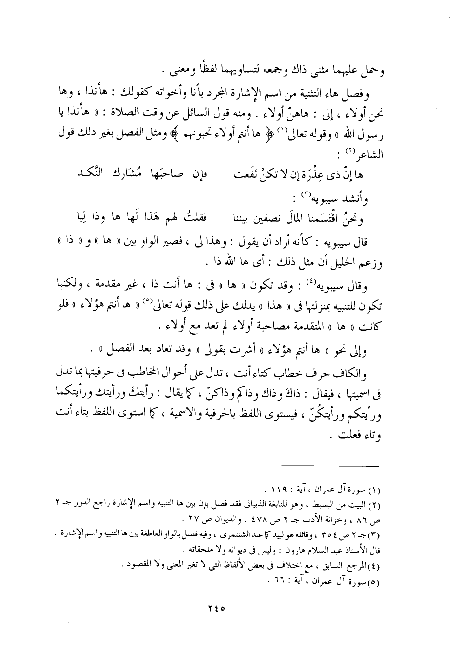 وفصل هاء التثنية من اسم الإشارة المجرد بأنا وأخواته كقولك: هأنذا، وها نحن أولاء، إلى: هاهنّ أولاء. ومنه قول السائل عن وقت الصلاة: "هأنذا يا رسول الله" وقوله تعالى (ها أنتم أولاء تحبونهم) ومثل الفصل بغير ذلك قول الشاعر: