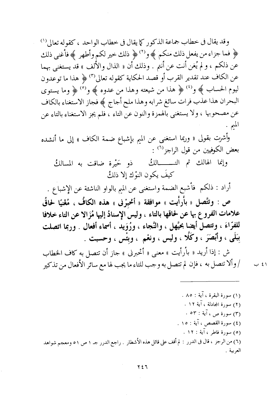 ص: وتتَّصل "بأَرأَيت" موافقة "أخْبِرْني" هذه الكاف، مُغْنيًا لحاقُ علامات الفروع بها عن لحاقها بالتاء، وليس الإسنادُ إليها مُزالا عن التاء خلافا للفرّاء، وتتصل أيضا بحيَّهل، والنَّجاء، ورُوَيد، أسماء أفعال. وربما اتصلت بِبَلى، وأبْصَرَ، وكَلاّ، وليس، ونعْم، وبِئْس، وحسبت.