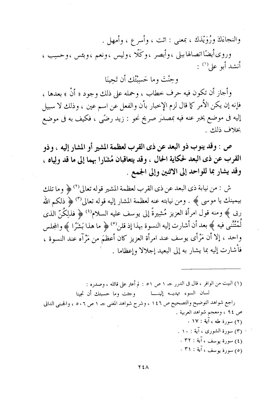 ش: من نيابة ذي البعد عن ذي القرب لعظمة المشير قوله تعالى (وما تلك بيمينك يا موسى). ومن نيابته عنه لعظمة المشار إليه قوله تعالى (ذلكم الله ربي) ومنه قول امرأة العزيز مُشِيرةً إلى يوسف عليه السلام (فذلِكُنّ الذي لُمتُنَّنِي فيه) بعد أن أشارت إليه النسوة بهذا إذ قلن (ما هذا بَشَرًا) والمجلس واحد، إلا أن مَرْأى يوسف عند امرأة العزيز كان أعظمَ من مَرْآه عند النسوة، فأشارة إليه بما يشار به إلى البعيد إجلالا وإعظاما.