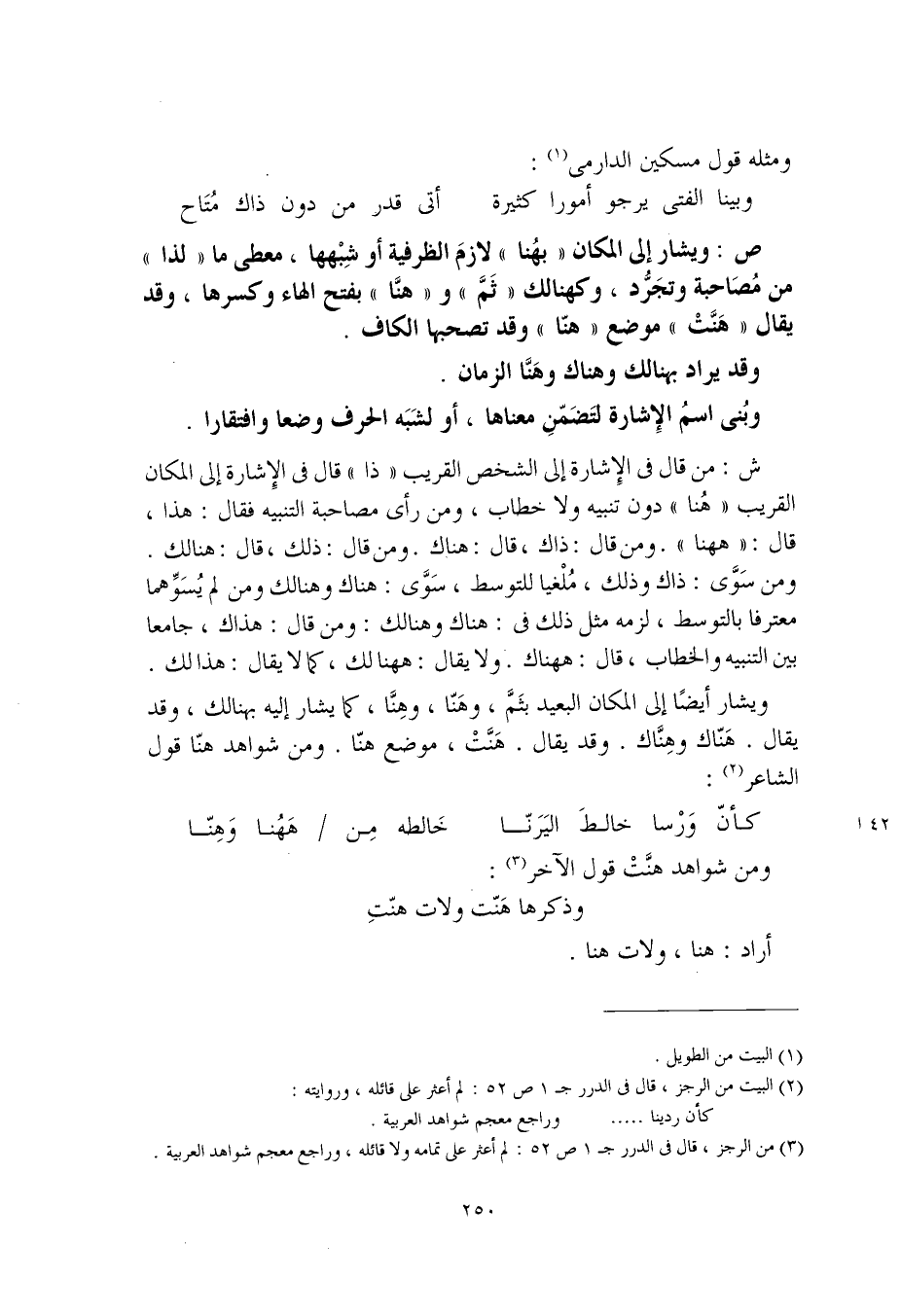 ص: ويشار إلى المكان "بهُنا" لازمَ الظرفية أو شِبْهها، معطى ما "لذا" من مُصاحبة وتجَرُّد، وكهنالك "ثَمَّ" و"هنّا" بفتح الهاء وكسرها، وقد يقال "هَنَّتْ" موضع "هنّا" وقد تصحبها الكاف.