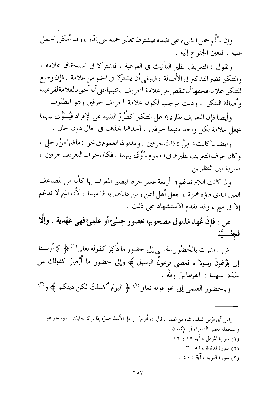 ش: أشرت بالحُضُور الحسي إلى حضور ما ذُكِرَ كقوله تعالى (كما أرسلنا إلى فِرْعون رسولا * فعصى فرعون الرسول) وإلى حضور ما أُبْصِرَ كقولك لمن سدّد سهما: القرطاسَ والله.