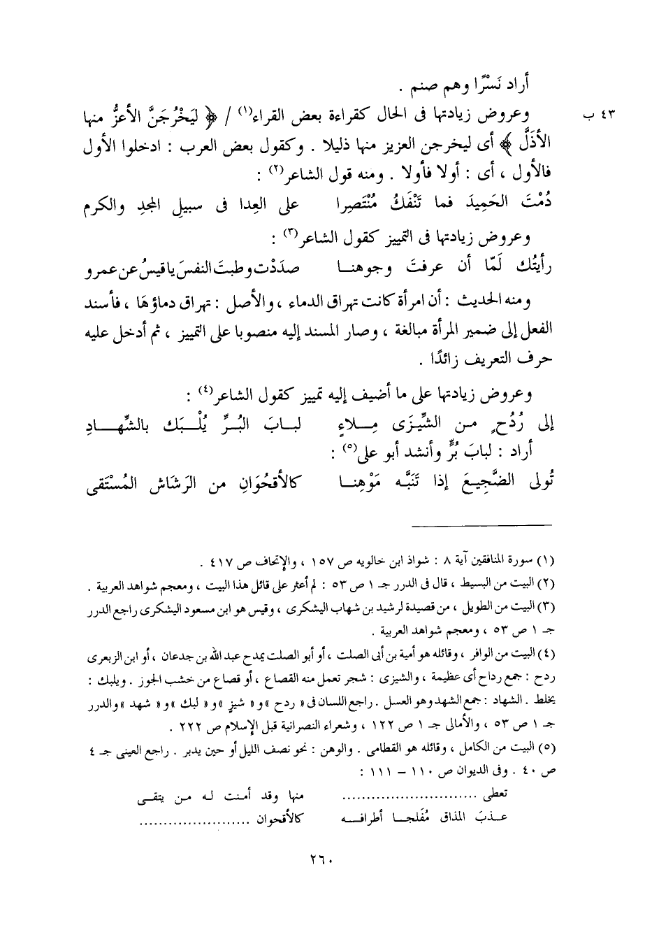 وعروض زيادتها في الحال كقراءة بعض القراء (ليَخْرُجَنَّ الأعزُّ منها الأذَلَّ) أي ليخرجن العزيز منها ذليلا. وكقول بعض العرب: ادخلوا الأول فالأول، أي: أولا فأولا. ومنه قول الشاعر: