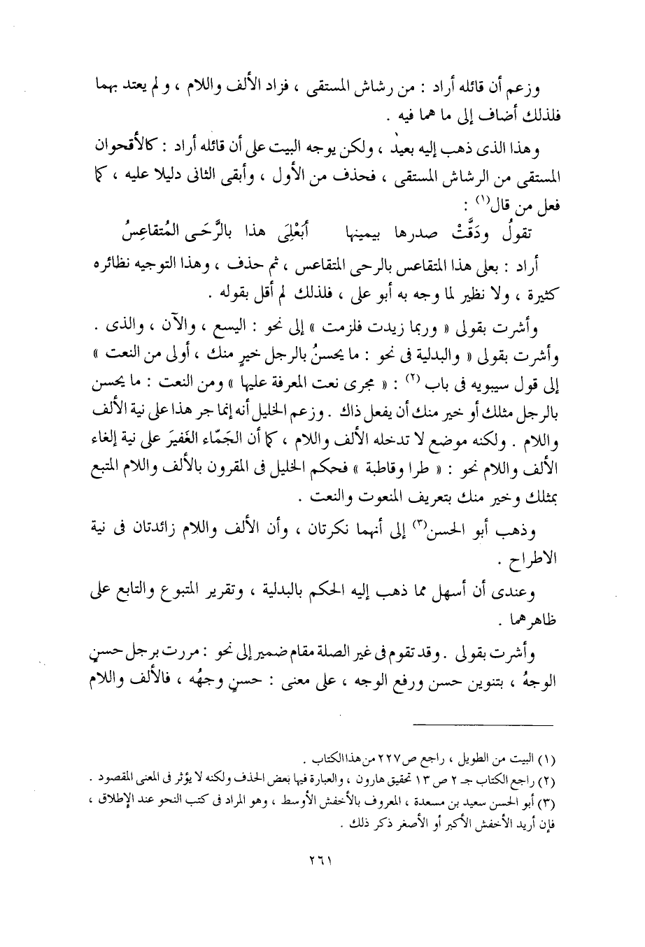 وأشرت بقولي "وبما زيدت فلزمت" إلى نحو: اليسع، والآن، والذي. وأشرت بقولي "والبدلية في نحو: ما يحسنُ بالرجل خيرٍ منك، أولى من النعت" إلى قول سيبويه في باب: "مجرى نعت المعرفة عليها" ومن النعت: ما يحسن بالرجل مثلك أو خير منك أن يفعل ذاك. وزعم الخليل أنه إنما جر هذا على نية الألف واللام. ولكنه موضع لا تدخله الألف واللام، كما أن الجَمّاء الغفيرَ على نية إلغاء الألف واللام نحو: "طرا وقاطبة" فحكم الخليل في المقرون بالألف واللام المتبع بمثلك وخير منك بتعريف المنعوت والنعت.