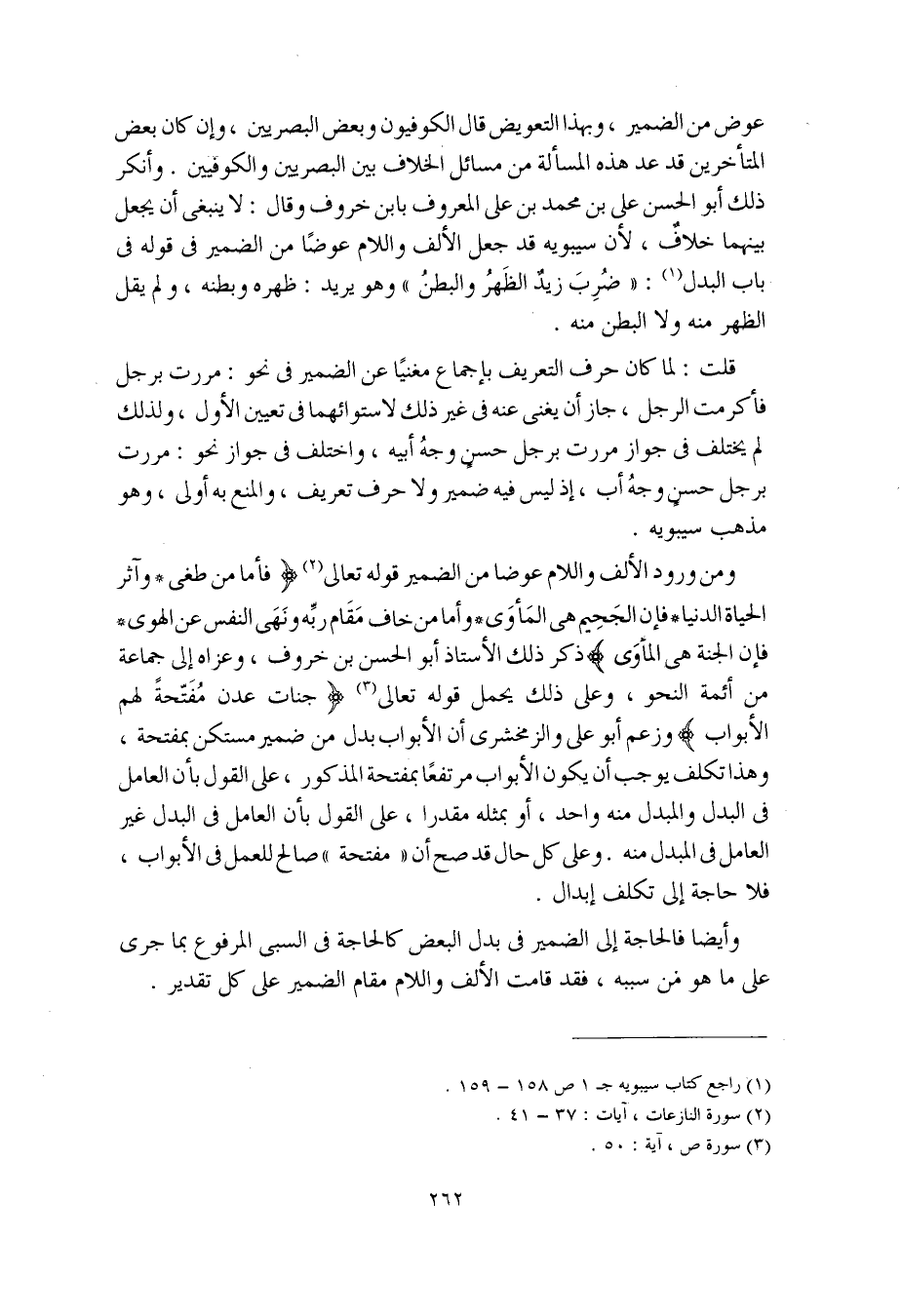 ومن ورود الألف واللام عوضا من الضمير قوله تعالى (فأما من طغى* وآثر الحياة الدنيا* فإن الجحيمَ هي المأوى* وأما من خاف مقام ربِّه ونَهى النفس عن الهوى* فإن الجنة هي المأوى) ذكر ذلك الأستاذ أبو الحسن بن خروف، وعزاه إلى جماعة من أئمة النحو، وعلى ذلك يحمل قوله تعالى (جنات عدن مُفَتّحةً لهم الأبواب) وزعم أبو علي والزمخشري أن الأبواب بدل من ضمير مستكن بمفتحة، وهذا تكلف يوجب أن يكون الأبواب مرتفعًا بمفتحة المذكور، على القول بأن العامل في البدل والمبدل منه واحد، أو بمثله مقدرا، على القول بأن العامل في البدل غير العامل في المبدل منه. وعلى كل حال قد صح أن "مفتحة" صالح للعمل في الأبواب، فلا حاجة إلى تكلف إبدال.