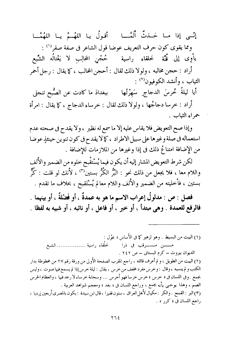 لكن شرط التعويض المشار إليه أن يكون فيما يُسْتقْبح خلوه من الضمير والألف واللام معا، فلا يجعل من ذلك نحو: البُرُّ الكُرُّ بستين، لأنك لو قلت: كُرٌّ بستين، فأخليته من الضمير والألف واللام معا لم يُسْتَقْبَح، بخلاف ما تقدم.