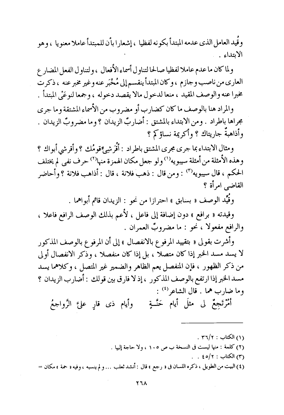 ومثال الابتداء بما جرى مجرى المشتق باطراد: أقُرَشِيٌّ قومُك؟ وأقرشي أبواك؟ وهذه الأمثلة من أمثلة سيبويه ولو جعل مكان الهمزة منها حرف نفي لم يختلف الحكم، قال سيبويه: ومن قال: ذهب فلانة، قال: أذاهب فلانة؟ وأحاضر القاضي امرأة؟