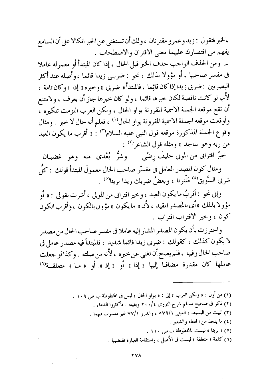 ومن الحذف الواجب حذف الخبر قبل الحال، إذا كان المبتدأ أو معموله عاملا في مفسر صاحبها، أو مؤولا بذلك، نحو: ضربي زيد قائما، وأصله عند أكثر البصريين: ضربي زيدا إذا كان قائما، فالمبتدأ "ضربي" وخبره "إذا" وكان تامة، لأنها لو كانت ناقصة لكان خبرها قائما، ولو كان خبرها لجاز أن يعرف، ولامتنع أن تقع موقعه الجملة الاسمية المقرونة بواو الحال، ولكن العرب التزمت تنكيره، وأوقعت موقعه الجملة الاسمية المقرونة بواو الحال، فعلم أنه حال لا خبر. ومثال وقوع الجملة المذكورة موقعه قول النبي عليه السلام: "أقرب ما يكون العبد من ربه وهو ساجد" ومثله قول الشاعر:
