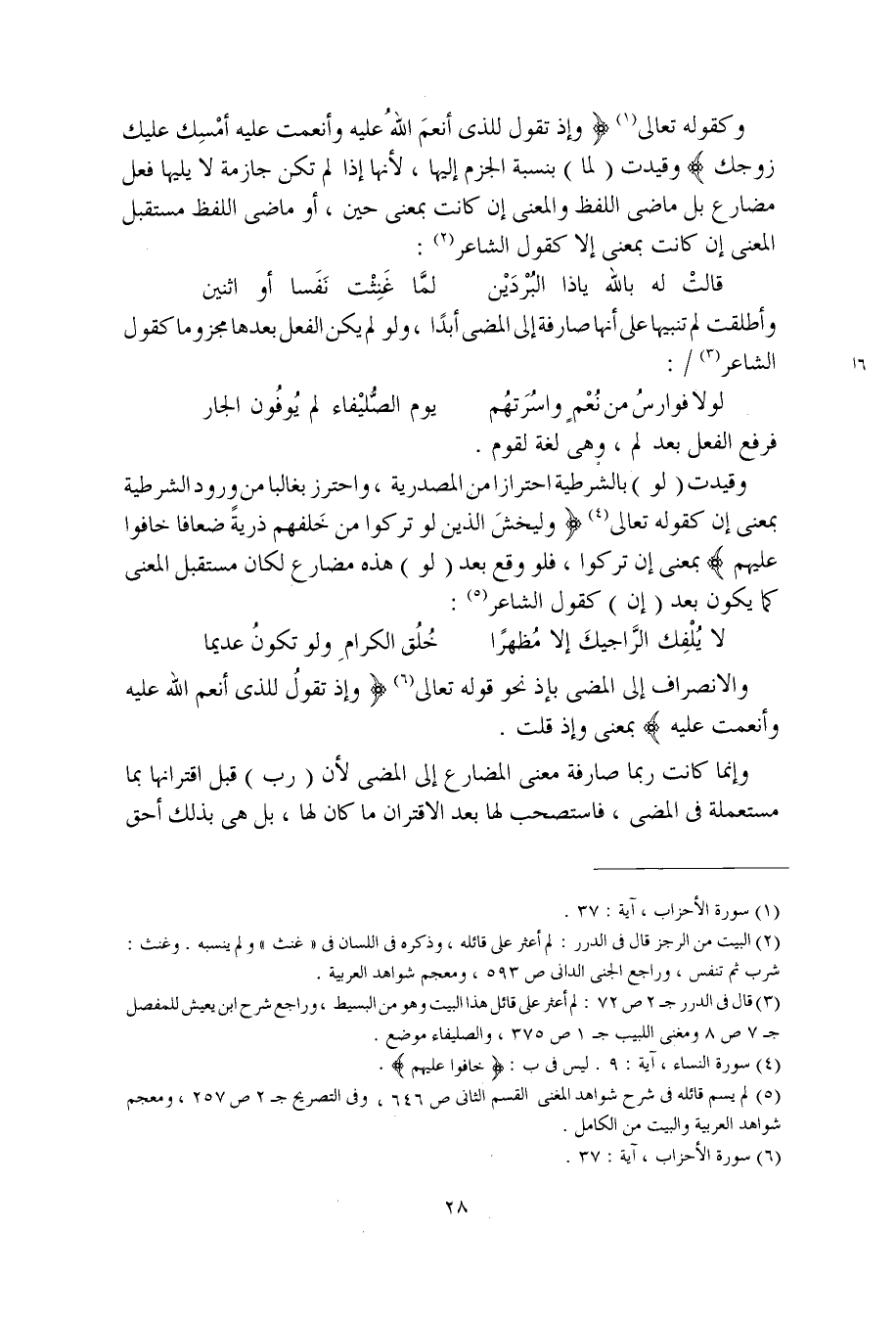 وكقوله تعالى (وإذ تقول للذي أنعم الله عليه وأنعمت عليه أمسك عليك زوجك) وقيدت (لما) بنسبة الجزم إليها، لأنها إذا لم تكن جازمة لا يليها فعل مضارع بل ماضي اللفظ والمعنى إن كانت بمعنى حين، أو ماضي اللفظ مستقبل المعنى إن كانت بمعنى إلا كقول الشاعر: