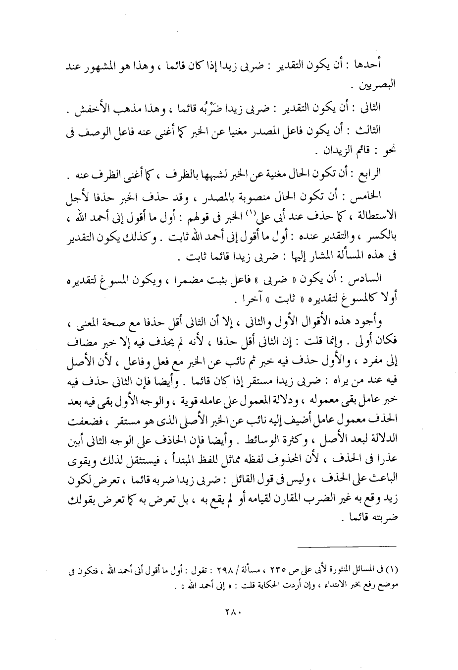 الخامس: أن تكون الحال منصوبة بالمصدر، وقد حذف الخبر حذفا لأجل الاستطالة، كما حذف عند أبي علي الخبر في قولهم: أول ما أقول إني أحمد الله، بالكسر، والتقدير عنده: أول ما أقول إني أحمد الله ثابت. وكذلك يكون التقدير في هذه المسألة المشار إليها: ضربي زيدا قائما ثابت.