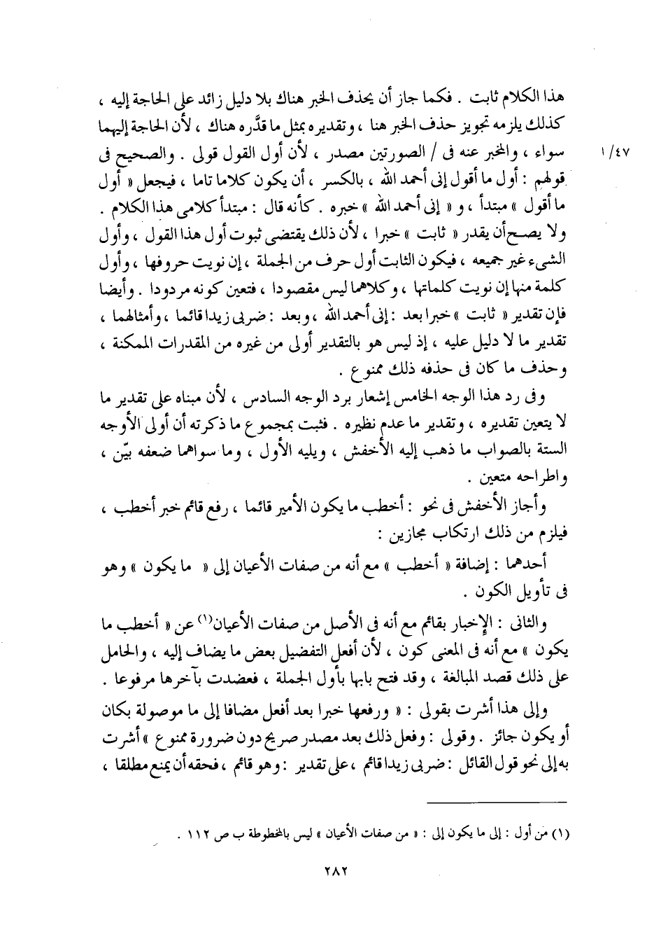 هذا الكلام ثابت. فكما جاز أن يحذف الخبر هناك بلا دليل زائد على الحاجة إليه، كذلك يلزمه تجويز حذف الخبر هنا، وتقديره بمثل ما قدَّره هناك، لأن الحاجة إليهما سواء، والمخبر عنه في الصورتين مصدر، لأن أول القول قولي. والصحيح في قولهم: أول ما أقول إني أحمد الله، بالكسر، أن يكون كلاما تاما، فيجعل "أول ما أقول" مبتدأ، و"إني أحمد الله" خبره. كأنه قال: مبتدأ كلامي هذا الكلام. ولا يصح أن يقدر "ثابت" خبرا، لأن ذلك يقتضي ثبوت أول هذا القول، وأول الشيء غير جميعه، فيكون الثابت أول حرف من الجملة، إن نويت حروفها، وأول كلمة منها إن نويت كلماتها، وكلاهما ليس مقصودا، فتعين كونه مردودا. وأيضا فإن تقدير "ثابت" خبرا بعد: إني أحمد الله، وبعد: ضربى زيدا قائما، وأمثالهما، تقدير ما لا دليل عليه، إذ ليس هو بالتقدير أولى من غيره من المقدرات الممكنة، وحذف ما كان في حذفه ذلك ممنوع.