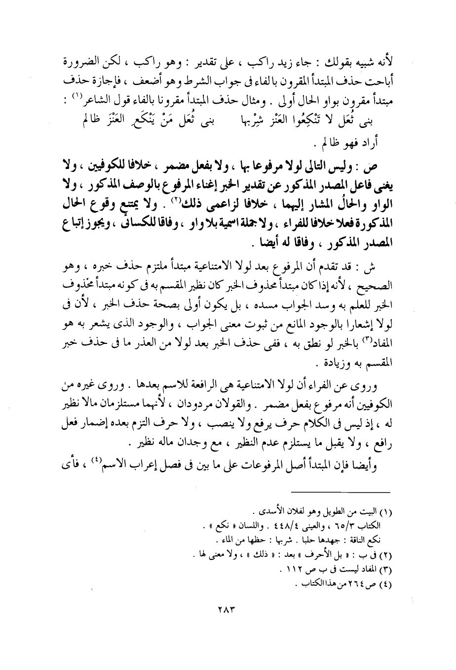 وروي عن الفراء أن لولا الامتناعية هي الرافعة للاسم بعدها. وروى غيره من الكوفيين أنه مرفوع بفعل مضمر. والقولان مردودان، لأنهما مستلزمان ما لا نظير له، إذ ليس في الكلام حرف يرفع ولا ينصب، ولا حرف التزم بعده إضمار فعل رافع، ولا يقبل ما يستلزم عدم النظير، مع وجدان ما له نظير.