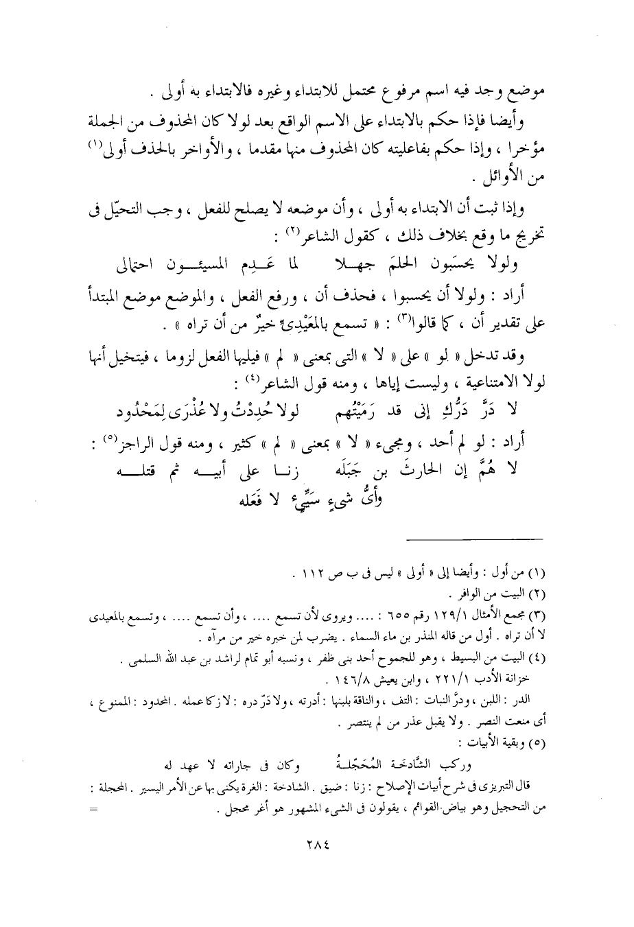 وأيضا فإذا حكم بالابتداء على الاسم الواقع بعد لولا كان المحذوف من الجملة مؤخرا، وإذا حكم بفاعليته كان المحذوف منها مقدما، والأواخر بالحذف أولى من الأوائل.