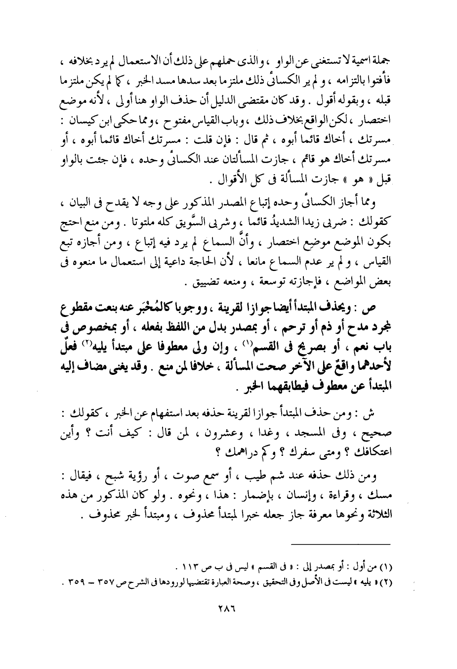 ش: ومن حذف المبتدأ جوازا لقرينة حذفه بعد استفهام عن الخبر، كقولك: صحيح، وفي المسجد، وغدا، وعشرون، لمن قال: كيف أنت؟ وأين اعتكافك؟ ومتى سفرك؟ وكم دراهمك؟