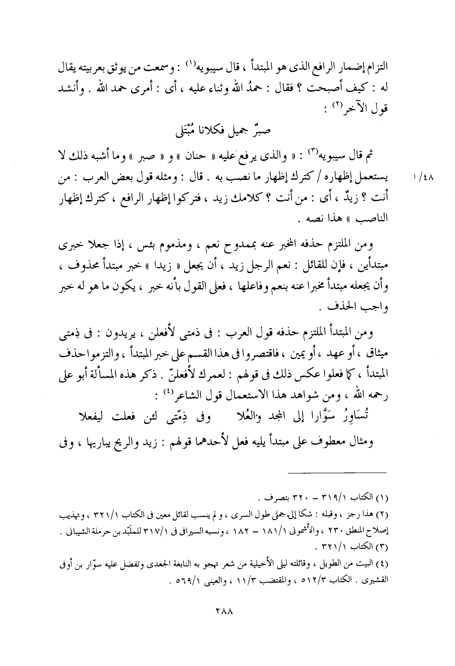ثم قال سيبويه: "والذي يرفع عليه "حنان" و"صبر" وما أشبه ذلك لا يستعمل إظهاره كترك إظهار ما نصب به. قال: ومثله قول بعض العرب: من أنت؟ زيدٌ، أي: من أنت؟ كلامك زيد، فتركوا إظهار الرافع، كترك إظهار الناصب" هذا نصه.
