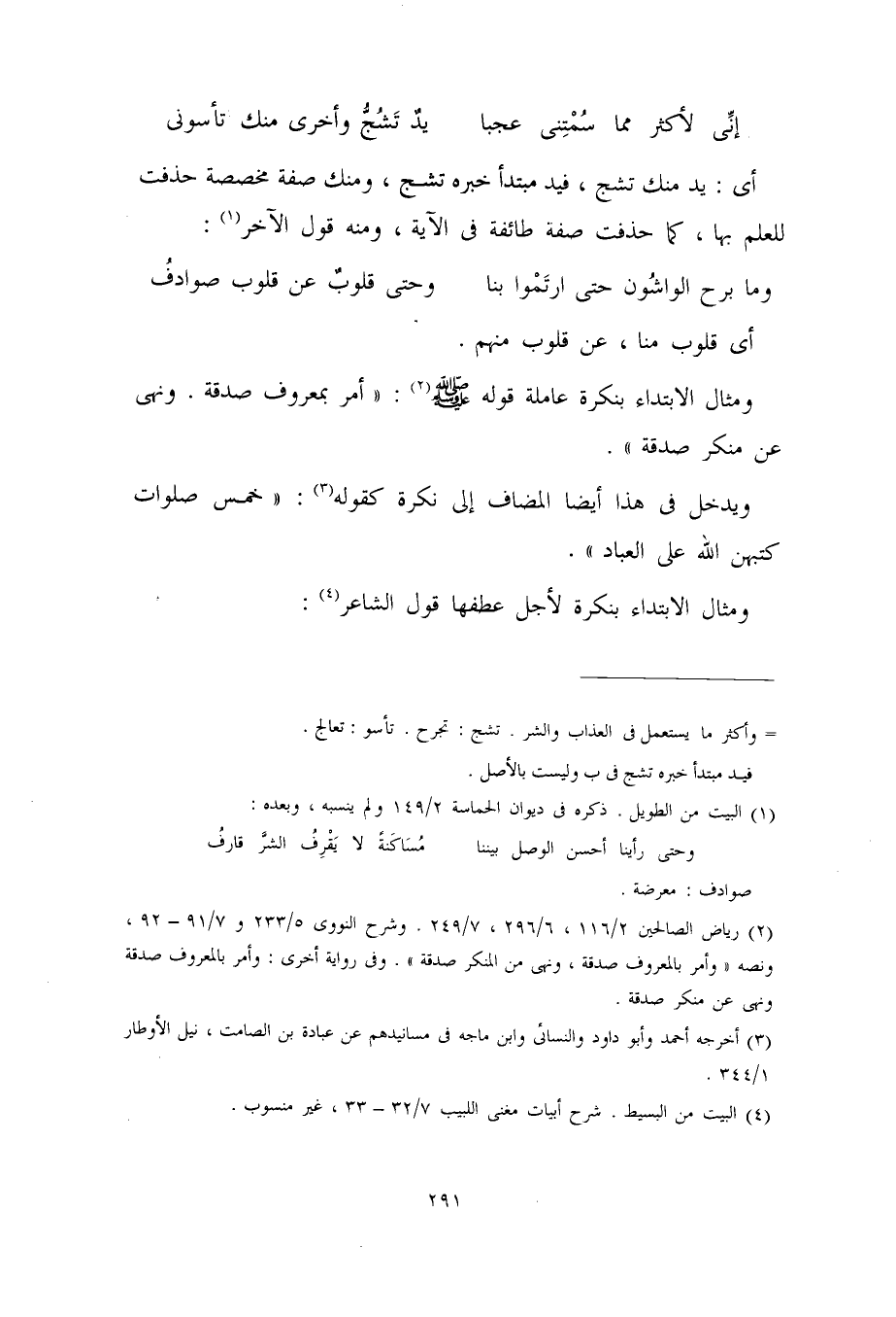 ومثال الابتداء بنكرة عاملة قوله صلى الله عليه وسلم: "أمر بمعروف صدفة، ونهي عن منكر صدقة".
