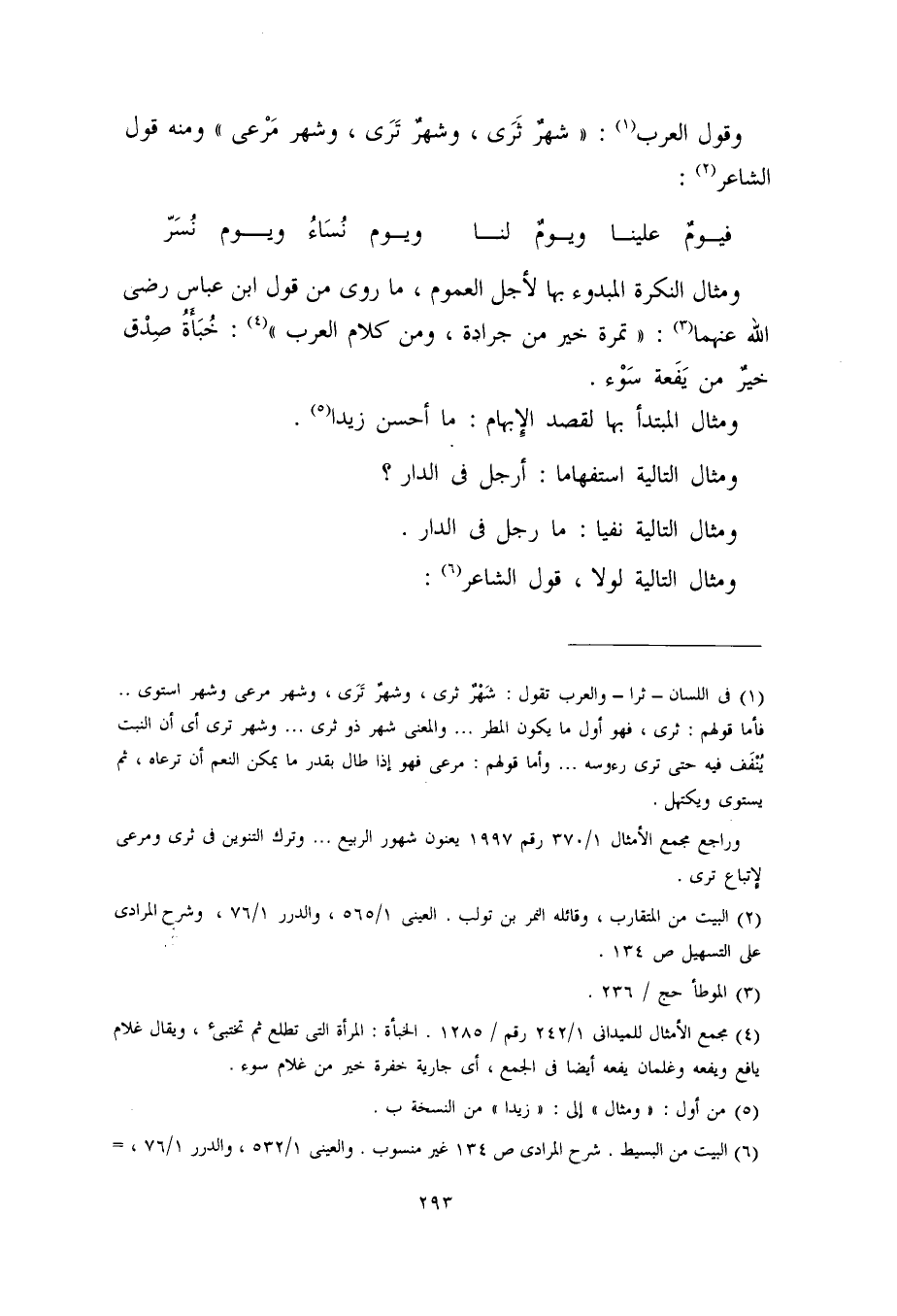 ومثال النكرة المبدوء بها لأجل العموم، وما روي من قول ابن عباس رضي الله عنهما: "تمرة خير من جرادة"، ومن كلام العرب: خُبَأَةُ صِدْق خيرٌ من يَفَعة سَوْء.