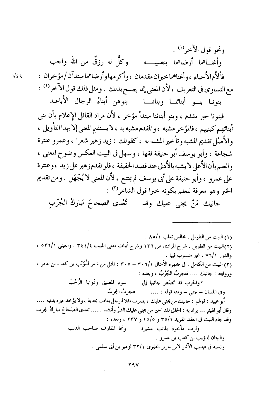 فبنونا خبر مقدم، وبنو أبنائنا مبتدأ مؤخر، لأن مراد القائل الإعلام بأن بني أبنائهم كبنيهم، فالمؤخر مشبه، والمقدم مشبه به، لا يستقيم المعنى إلا بهذا التأويل، والأصْل تقديم المشبه وتأخير المشبه به، كقولك: زيد زهير شعرا، وعمرو عنترة شجاعة، وأبو يوسف أبو حنيفة فقها، وسهل في البيت العكس وضوح المعنى، والعلم بأن الأعلى لا يشبه بالأدنى عند قصد الحقيقة، فلو تقدم زهير على زيد، وعنترة على عمرو، وأبو حنيفة على أبي يوسف لم يمتنع، لأن المعنى لا يُجْهَل. ومن تقديم الخبر وهو معرفة للعلم بكونه خبرا قول الشاعر: