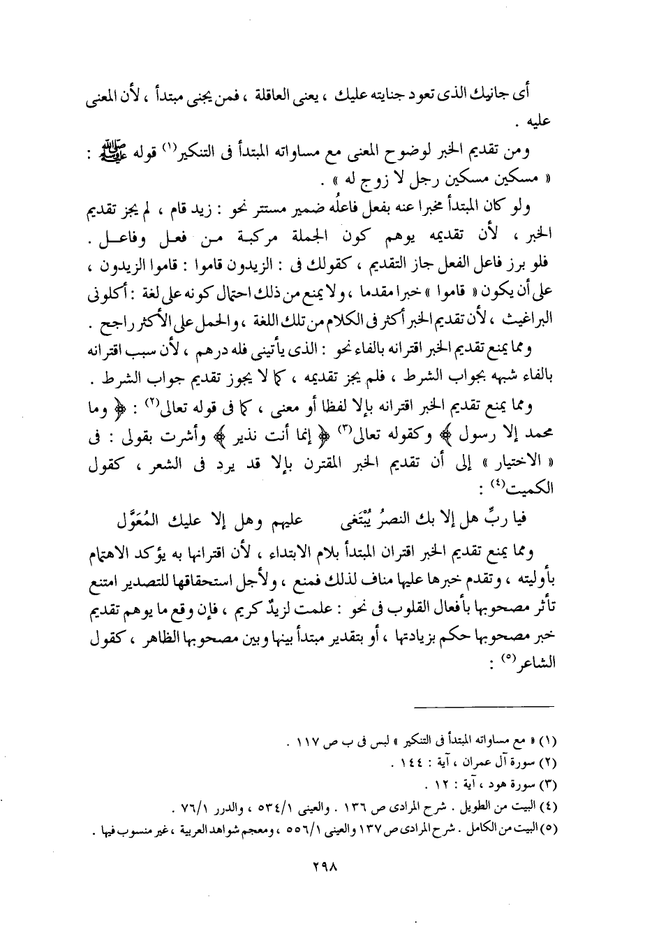 ومما يمنع تقديم الخبر اقترانه بإلا لفظا أو معنى، كما في قوله تعالى: (وما محمد إلا رسول) وكقوله تعالى (إنما أنت نذير) وأشرت بقولي: في "الاختيار" إلى أن تقديم الخبر المقترن بإلا قد يرد في الشعر، كقول الكميت:
