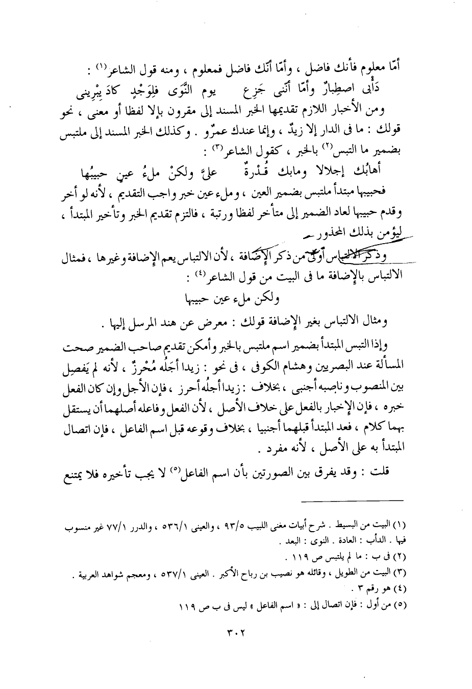 وذكر الالتباس أولى من ذكر الإضافة، لأن الالتباس يعم الإضافة وغيرها، فمثال الالتباس بالإضافة ما في البيت من قول الشاعر: