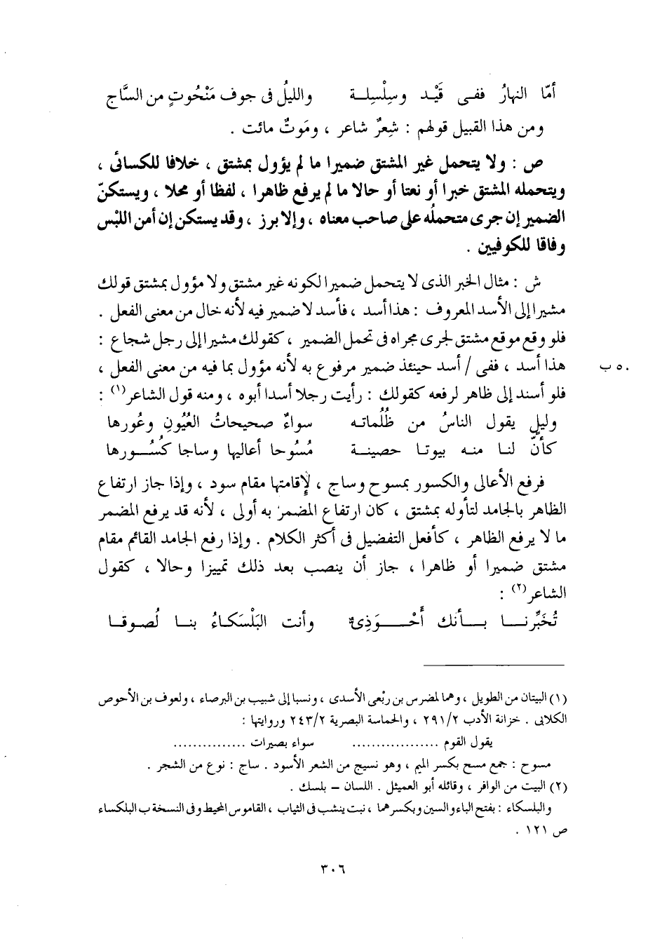 فرفع الأعالي والكسور بمسوح وساج، لإقامتها مقام سود، وإذا جاز ارتفاع الظاهر بالجامد لتأوله بمشتق، كان ارتفاع المضمر به أولى، لأنه قد يرفع المضمر ما لا يرفع الظاهر، كأفعل التفضيل في أكثر الكلام. وإذا رفع الجامد القائم مقام مشتق ضميرا أو ظاهرا، جاز أن ينصب بعد ذلك تمييزا وحالا، كقول الشاعر: