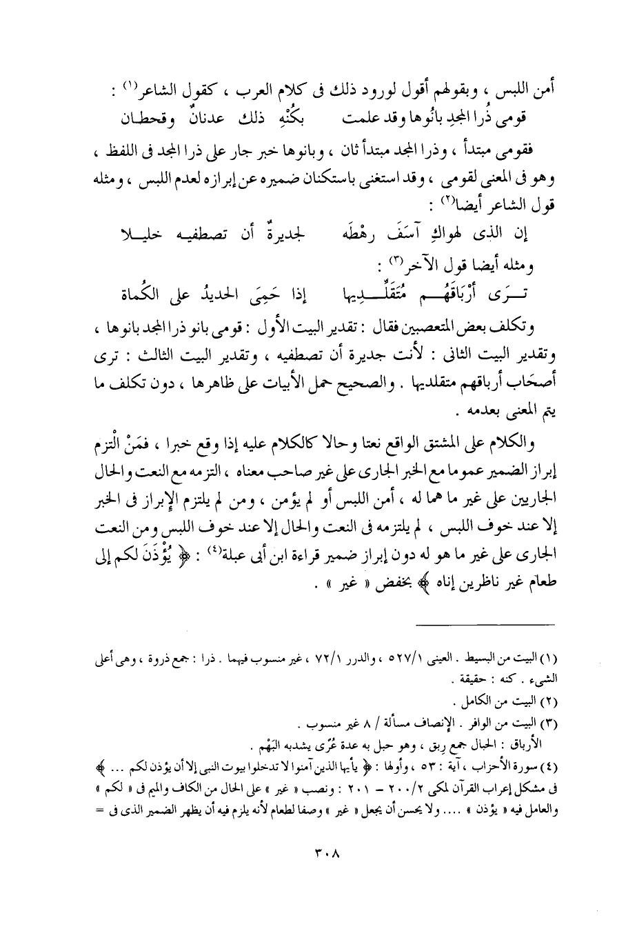 وتكلف بعض المتعصبين فقال: تقدير البيت الأول: قومي بانو ذرا المجد بانوها، وتقدير البيت الثاني: لأنت جديرة أن تصطفيه، وتقدير البيت الثالث: ترى أصحابَ أرباقهم متقلديها. والصحيح حمل الأبيات على ظاهرها، دون تكلف ما يتم المعنى بعدمه.