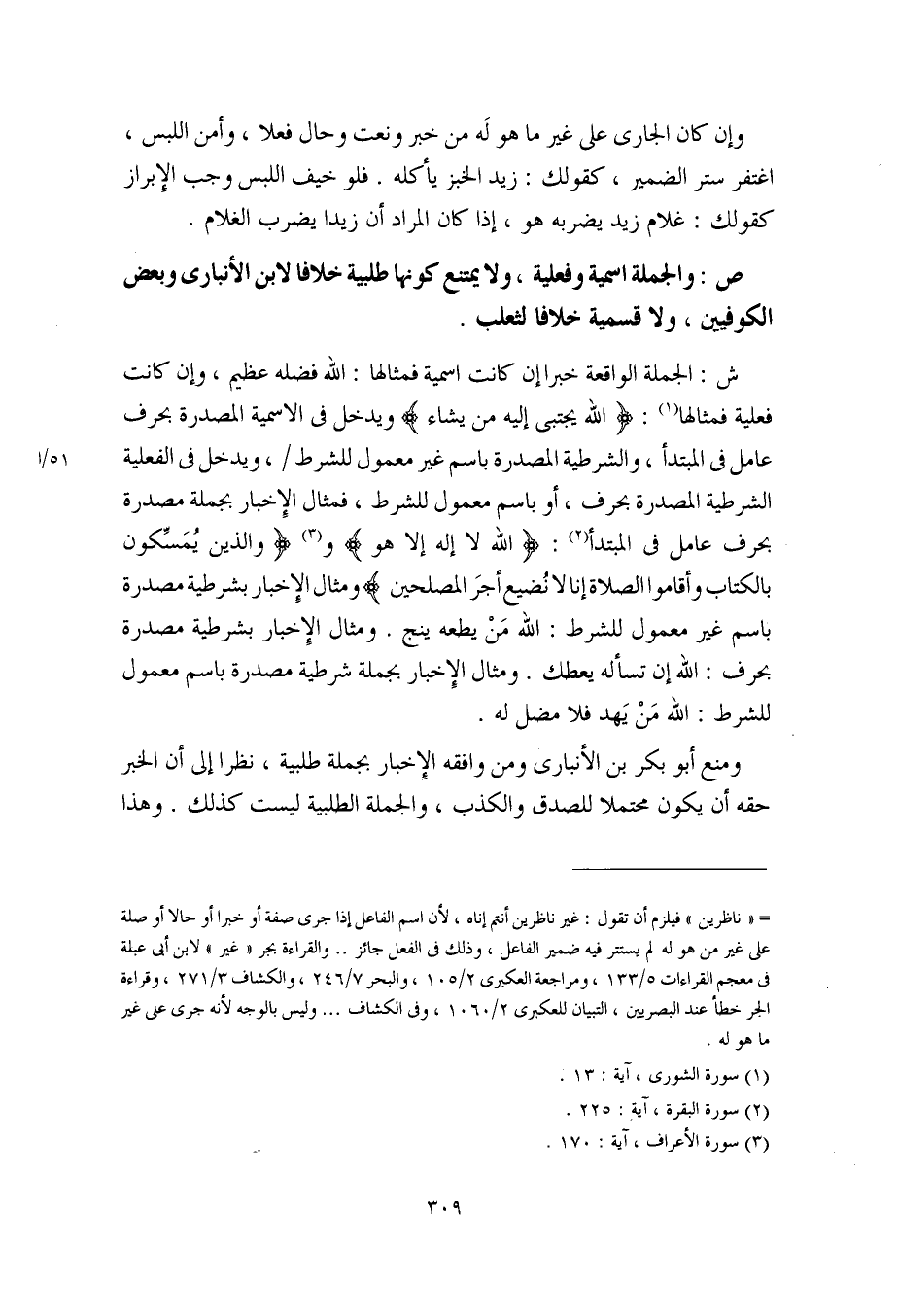 ش: الجملة الواقعة خبرا إن كانت اسمية فمثالها: الله فضله عظيم، وإن كانت فعلية فمثالها: (الله يجتبي إليه من يشاء) ويدخل في الاسمية المصدرة بحرف عامل في المبتدأ، والشرطية المصدرة باسم غير معمول للشرط، ويدخل في الفعلية الشرطية المصدرة بحرف، أو باسم معمول للشرط، فمثال الإخبار بجملة مصدرة بحرف عامل في المبتدأ: (الله لا إله إلا هو) و (والذين يُمَسِّكون بالكتاب وأقاموا الصلاة إنا لا نُضيع أجر المصلحين) ومثال الإخبار بشرطية مصدرة باسم غير معمول للشرط: الله مَنْ يطعه ينج. ومثال الإخبار بشرطية مصدرة بحرف: الله إن تسأله يعطك. ومثال الإخبار بجملة شرطية مصدرة باسم معمول للشرط: الله مَنْ يَهد فلا مضل له.