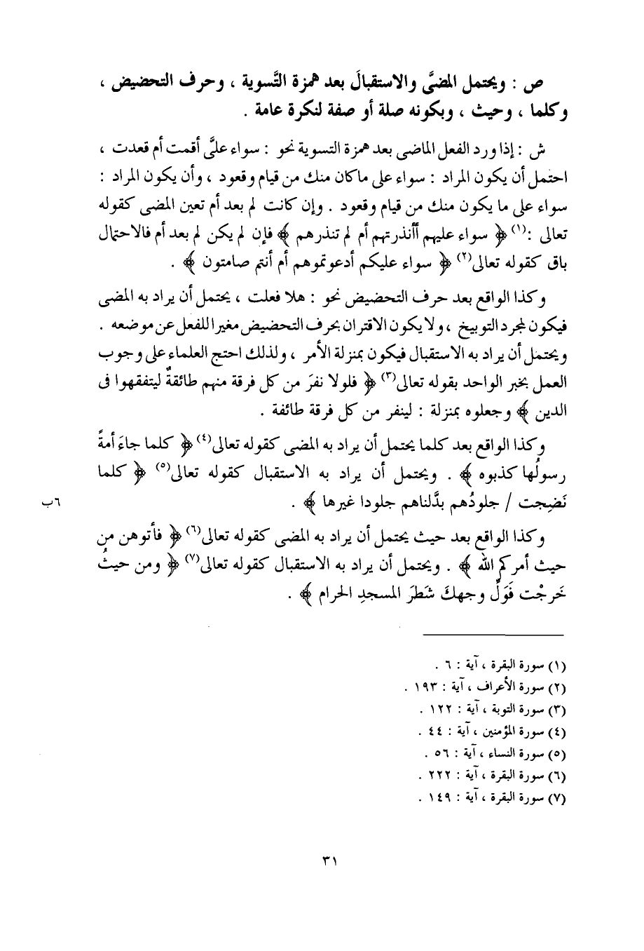 ش: إذا ورد الفعل الماضي بعد همزة التسوية نحو: سواء عليَّ أقمت أم قعدت، احتمل أن يكون المراد: سواء على ما كان منك من قيام وقعود، وأن يكون المراد: سواء على ما يكون منك من قيام وقعود. وإن كانت لم بعد أم تعين المضي كقوله تعالى: (سواء عليهم أأنذرتهم أم لم تنذرهم) فإن لم يكن لم بعد أم فالاحتمال باق كقوله تعالى (سواء عليكم أدعوتموهم أم أنتم صامتون).