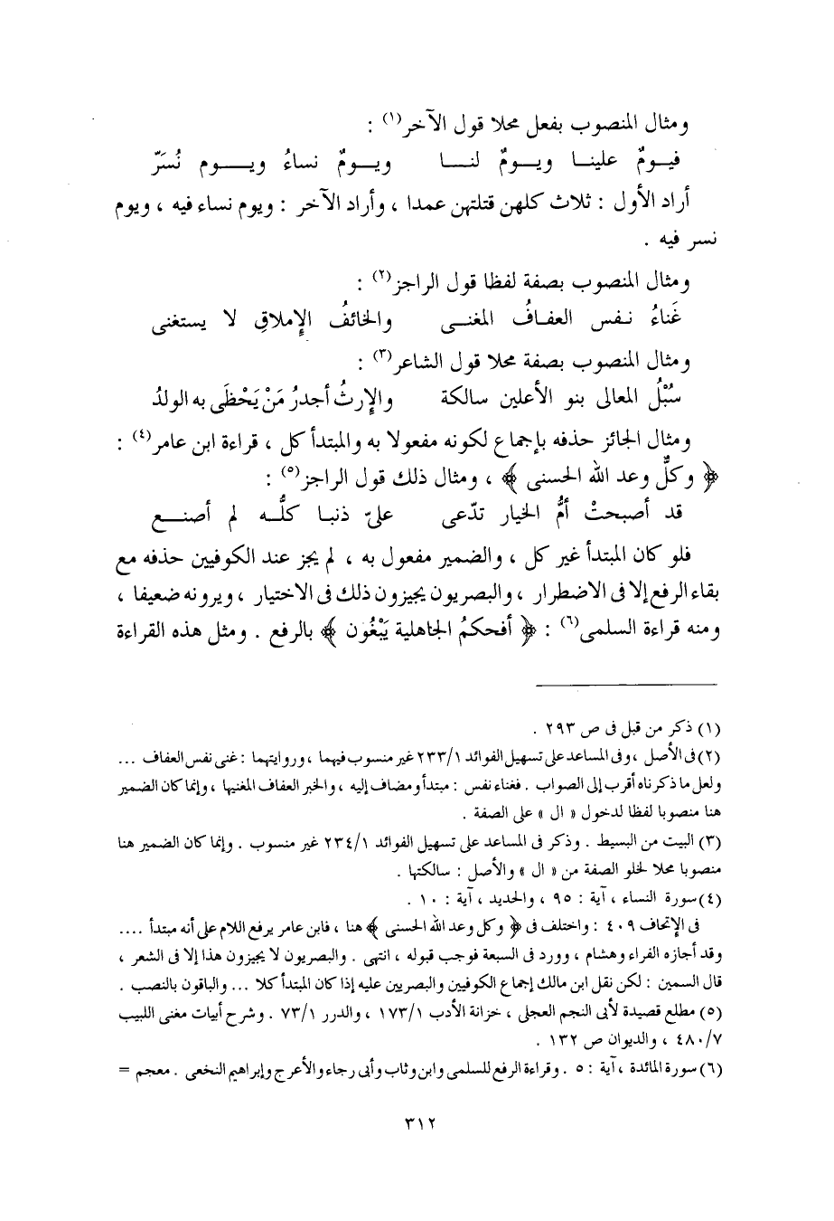 ومثال الجائز حذفه بإجماع لكونه مفعولا به والمبتدأ كل، قراءة ابن عامر: (وكلٌّ وعد الله الحسنى)، ومثال ذلك قول الراجز: